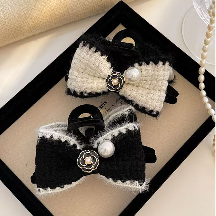 ツバキの花の黒い白いニットの蝶結びの髪は女性の秋冬の後頭部を挟んでサメの魚を挟んで気質の髪を飾ります。