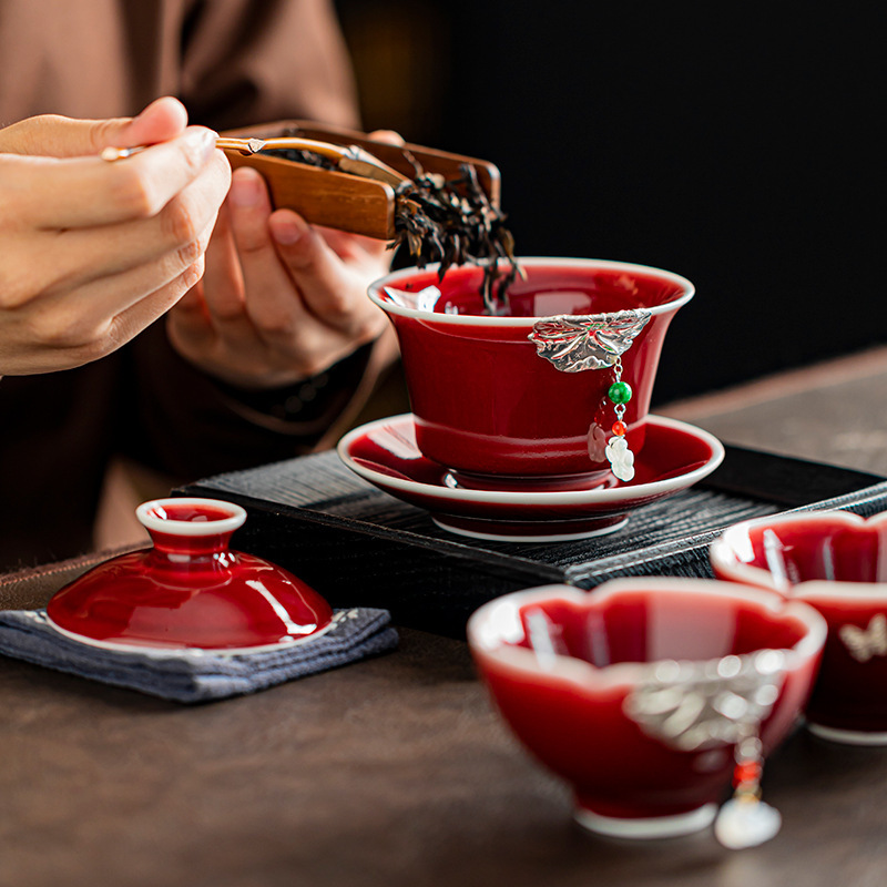 郎红三才盖碗镶银荷花陶瓷家用复古功夫茶具泡茶碗单个高档敬茶碗