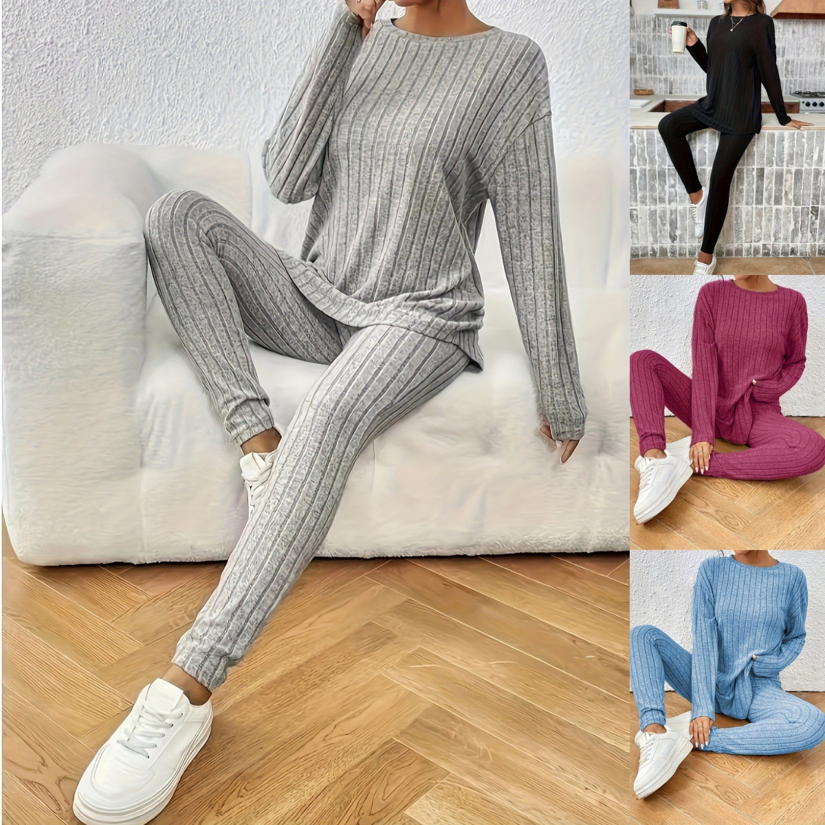 欧美跨境套装女2025秋季新款时尚休闲气质宽松圆领坑条针织套装女