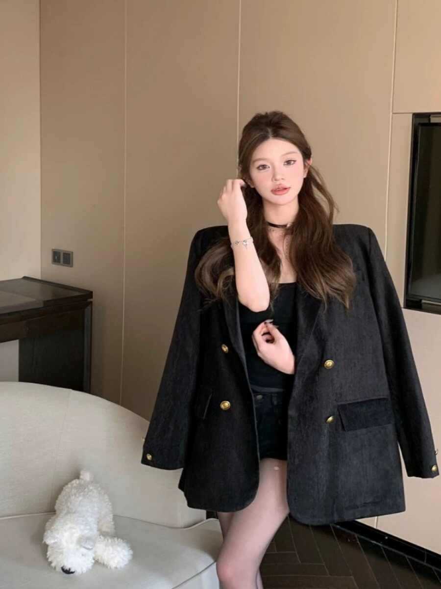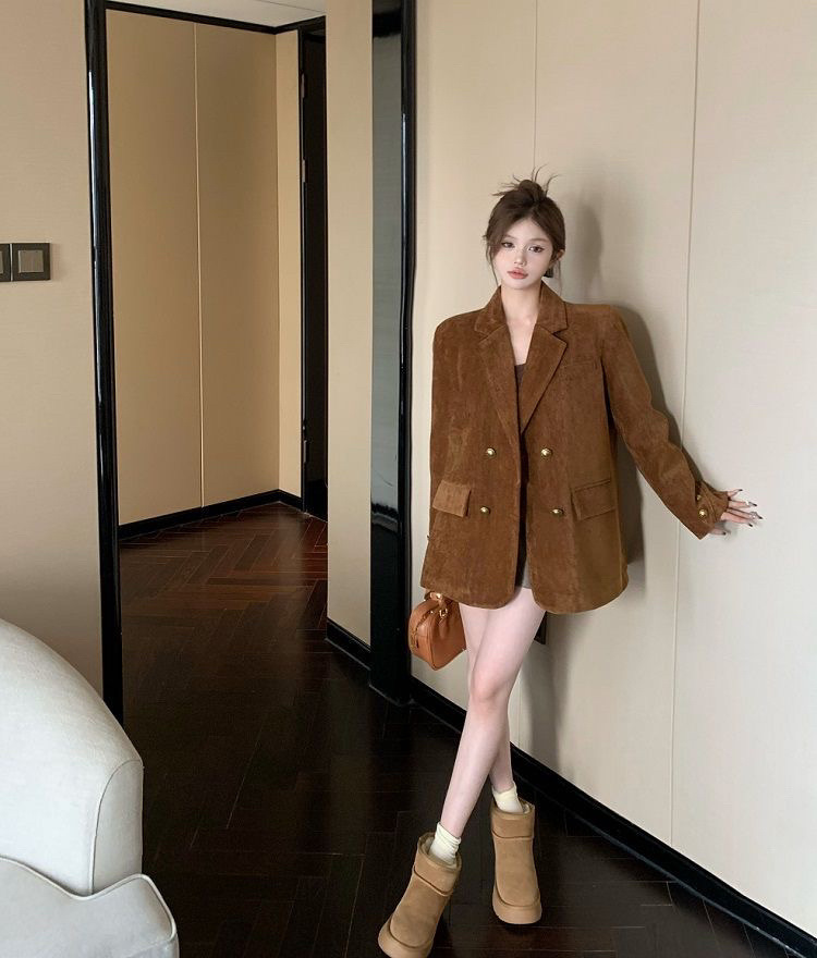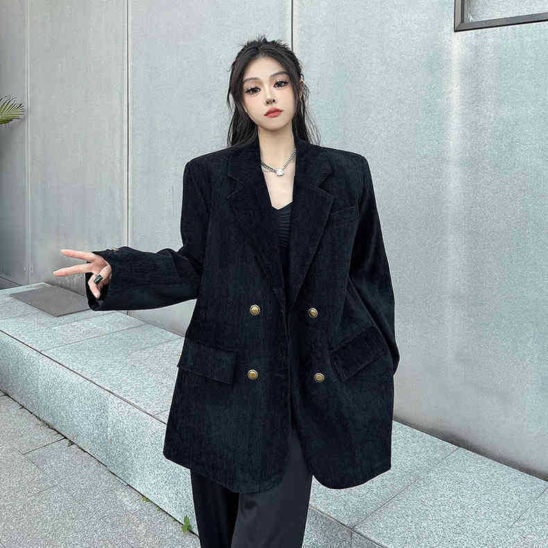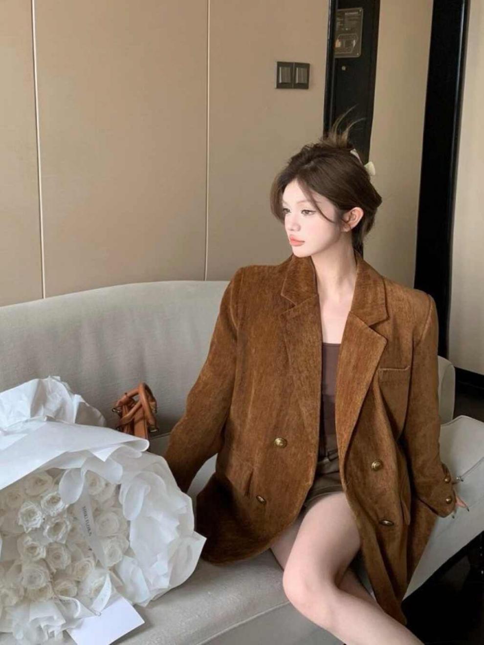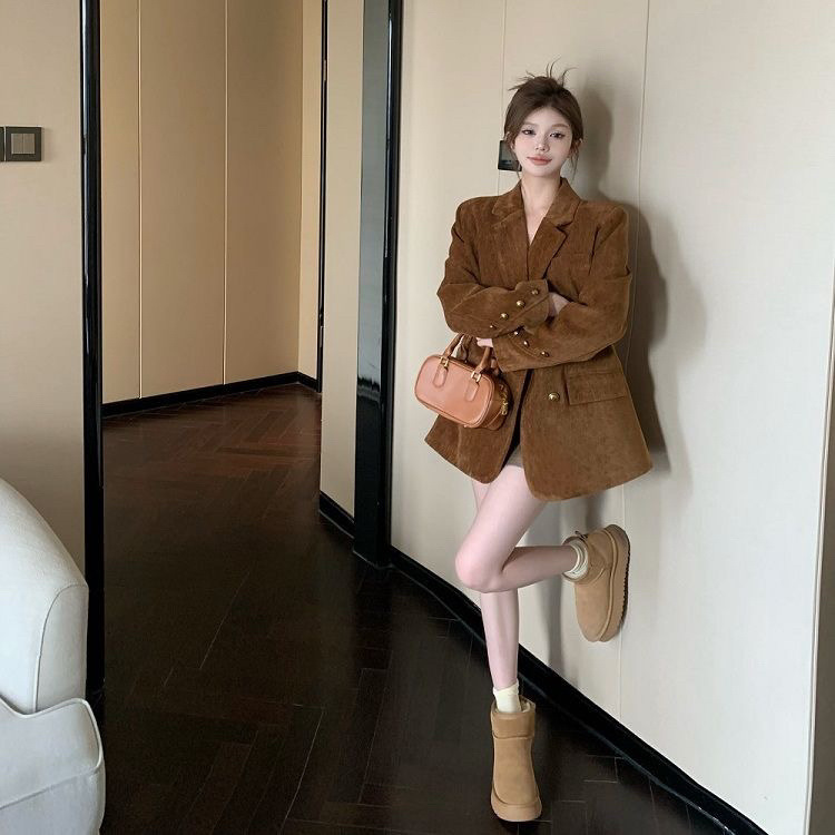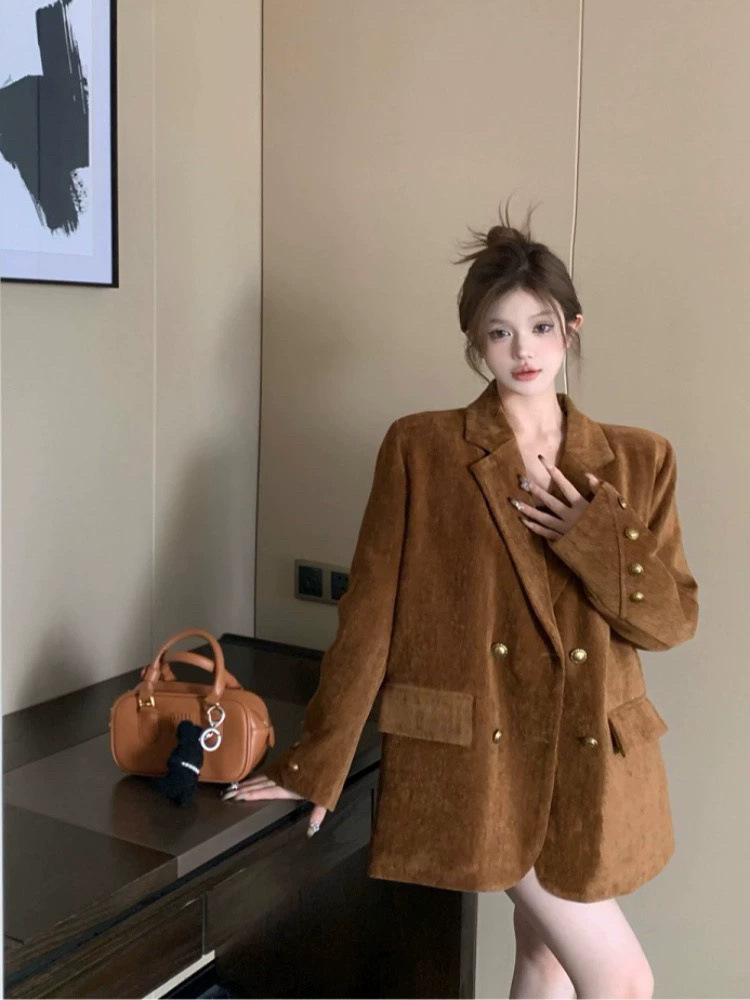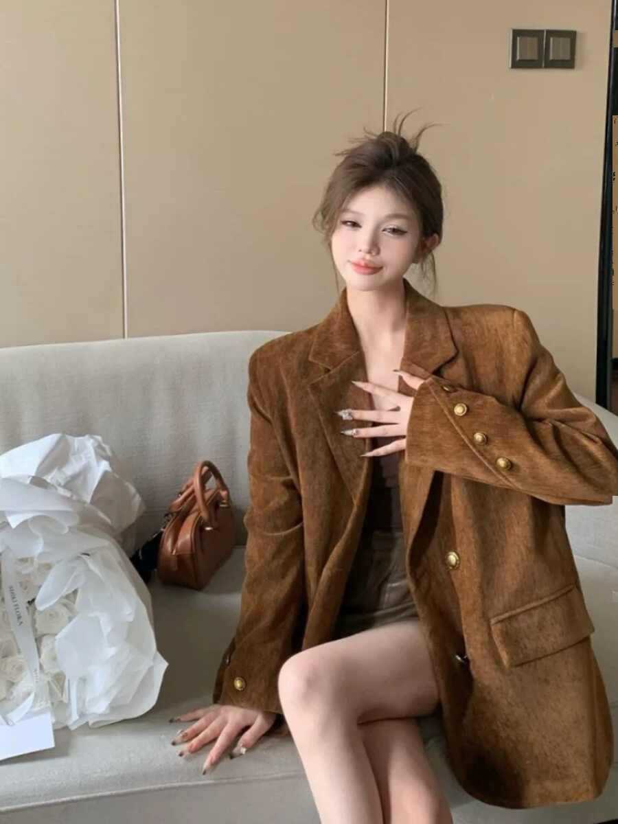 レトロなメイラード風コート、コーデュロイ素材、レディース、2025秋冬、厚手、綿入り、ゆったり、高級感のあるスーツ