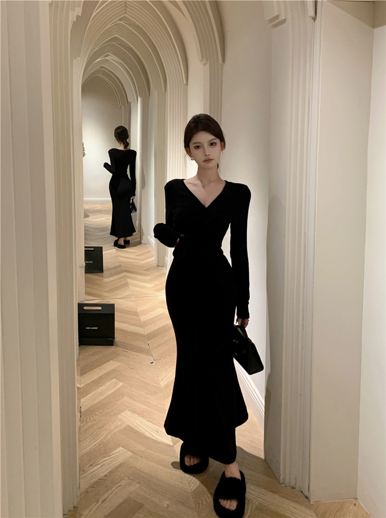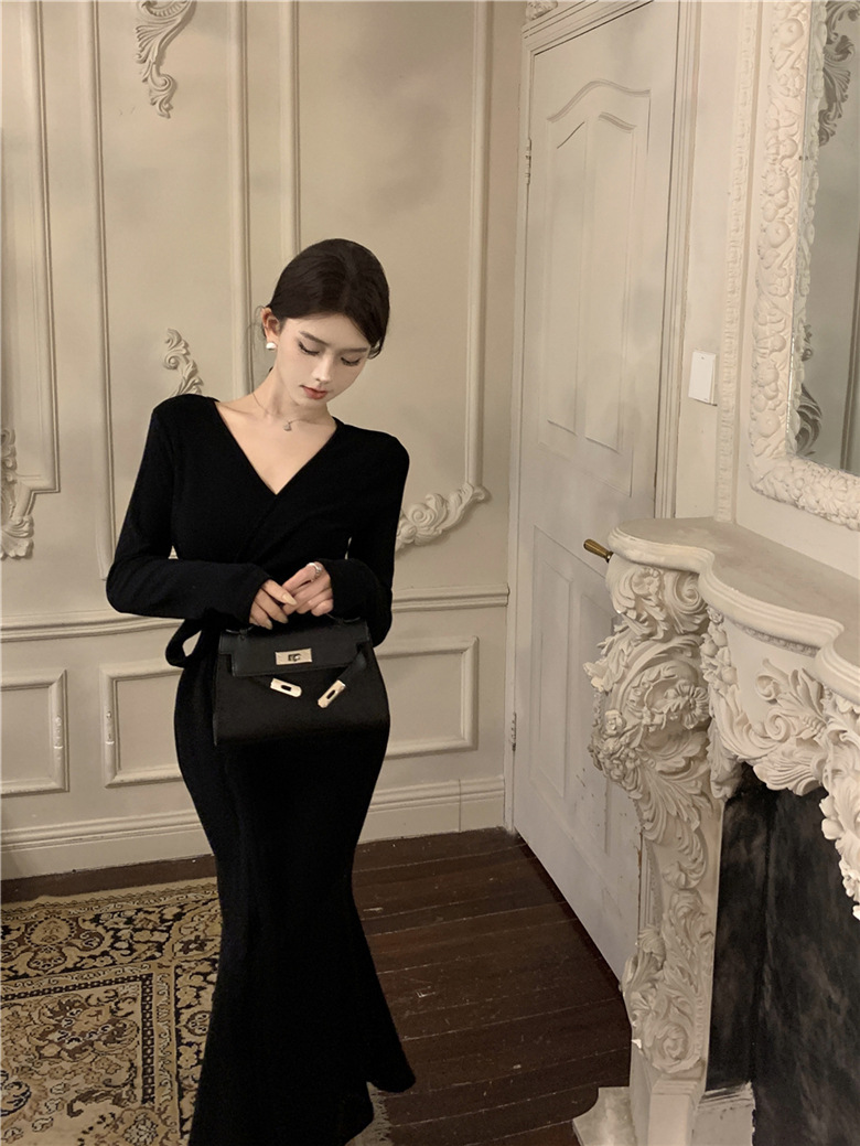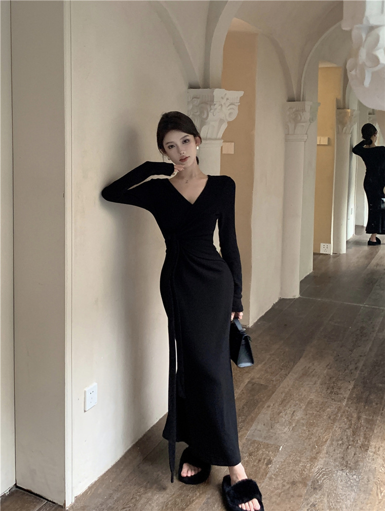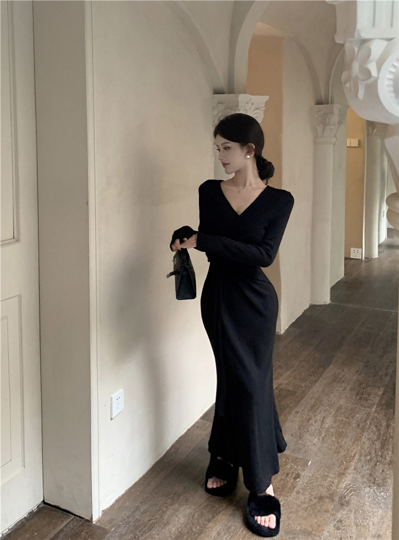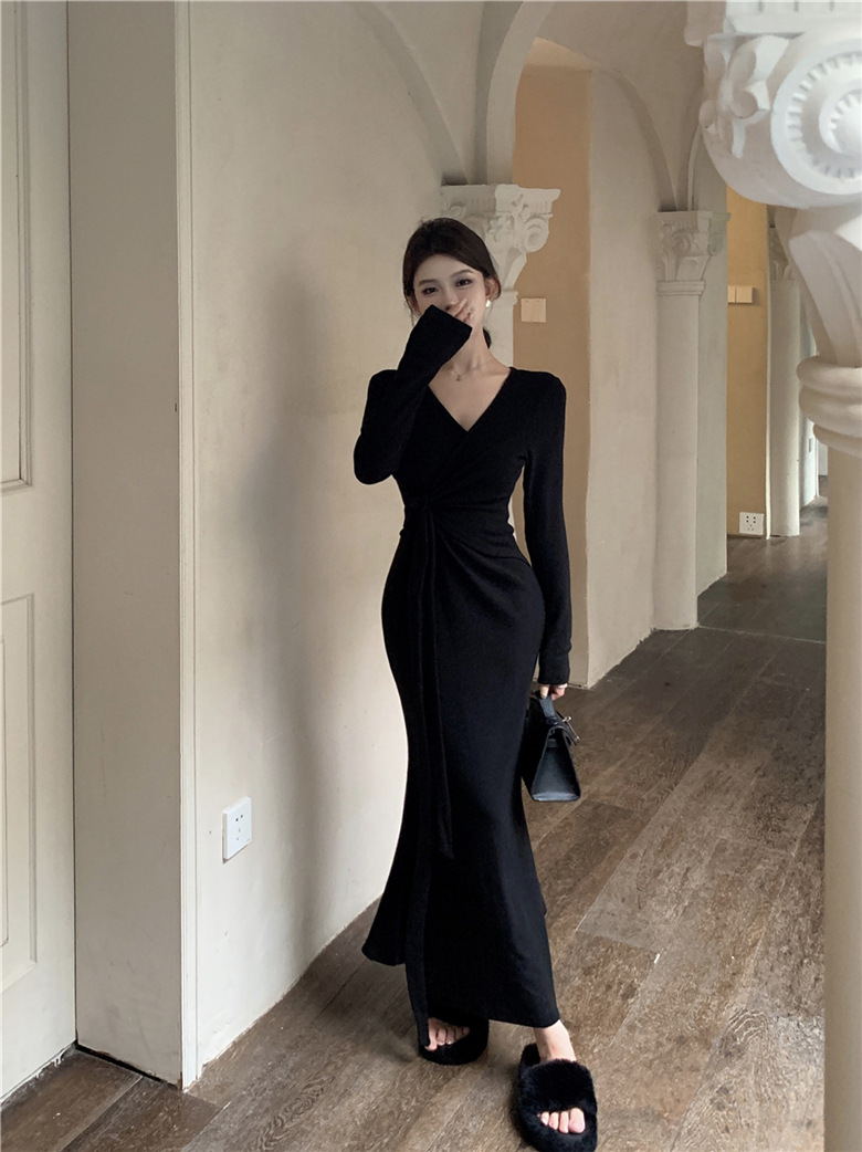 優しい風の気質vネックの中に長袖のニットのワンピースの女性の秋冬の黒色のギャルは腰を収めて長いスカートを修理します。