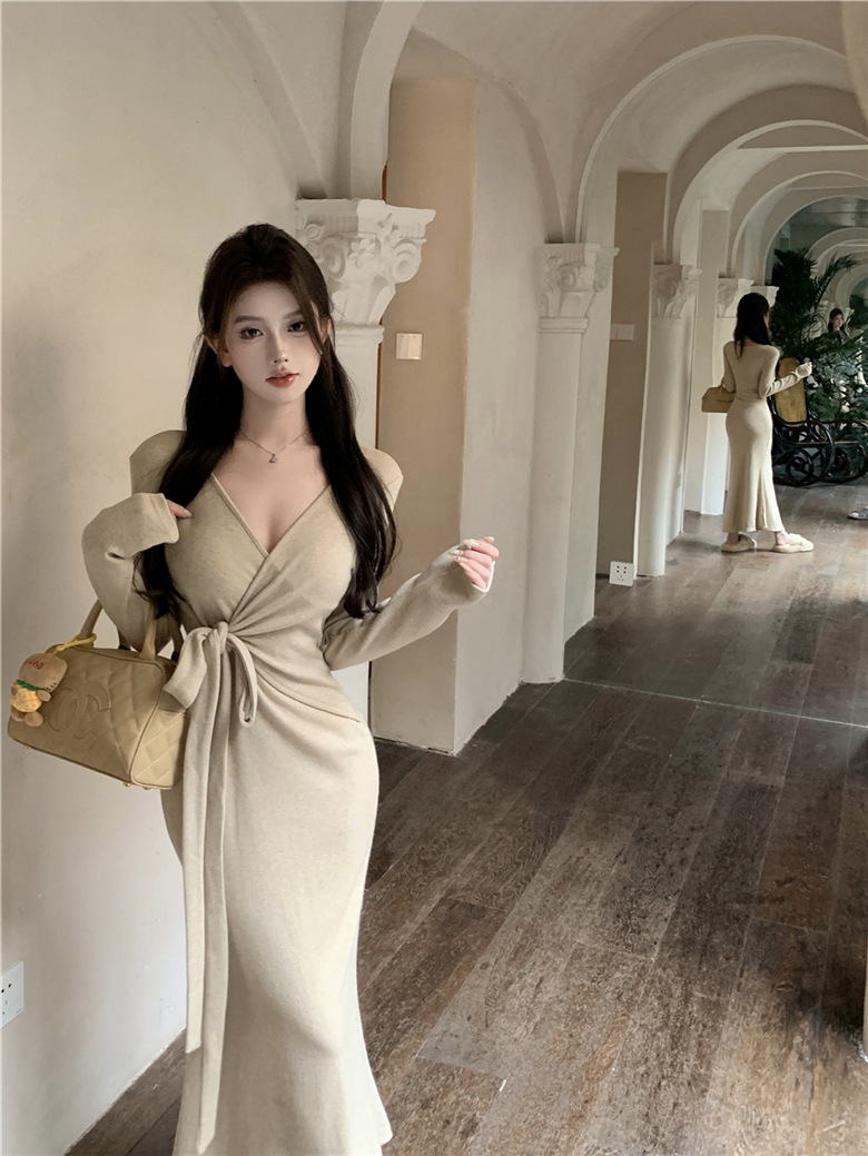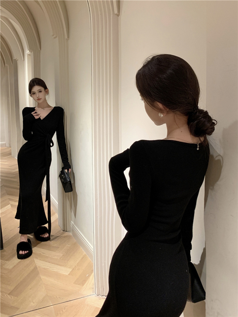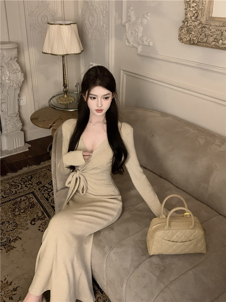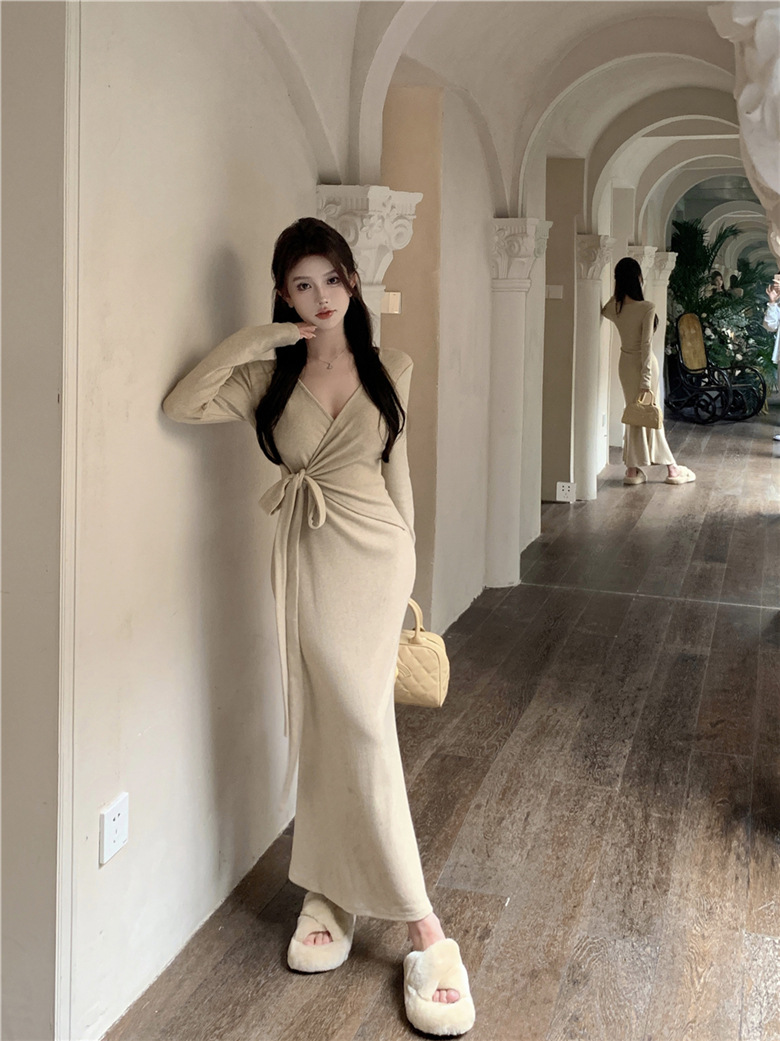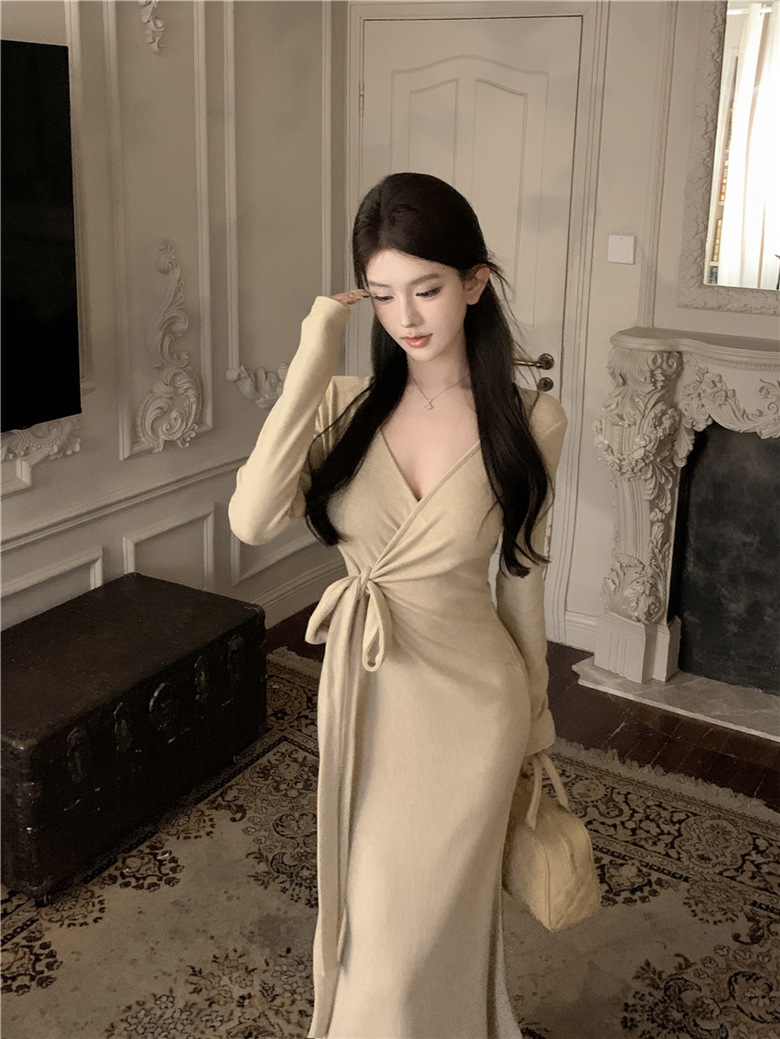 交叉v领长袖针连衣裙女秋冬打底内搭气质裙子收腰绑带包臀长裙