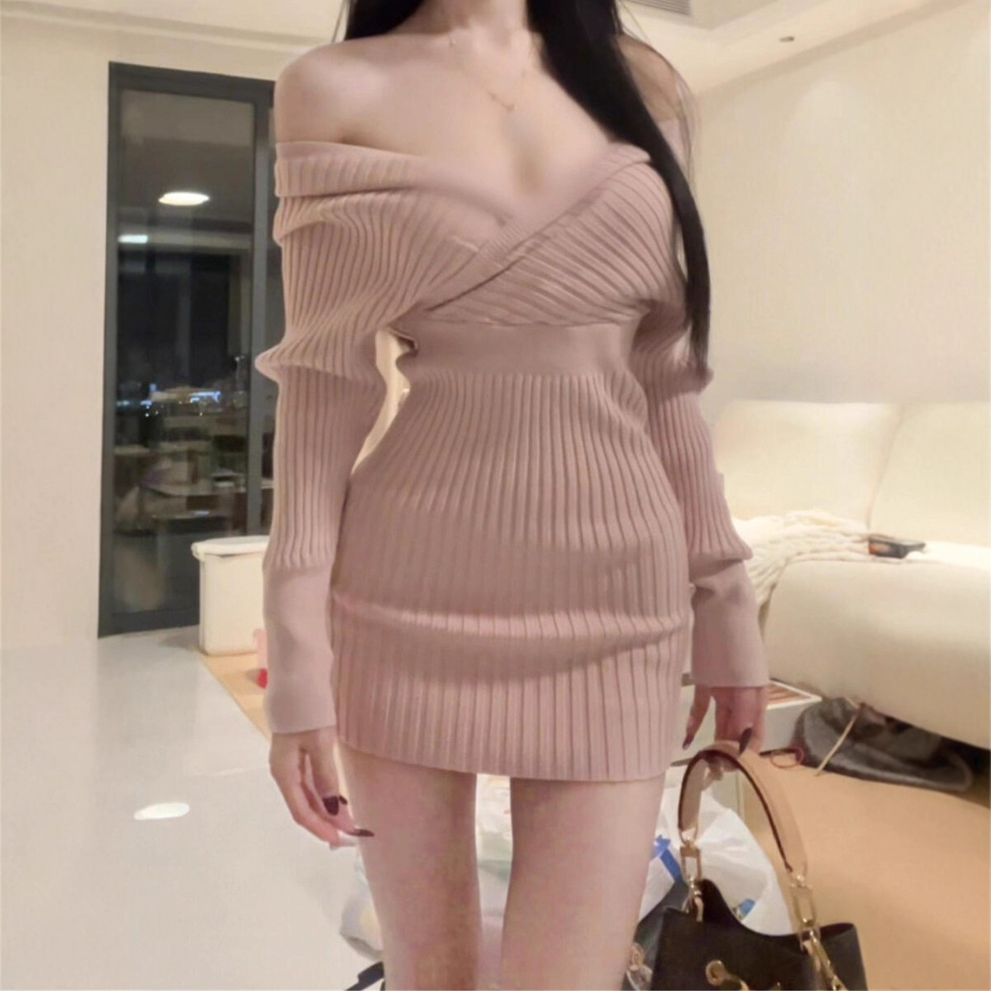 纯欲御姐风修身V领针织连衣裙子女秋冬新款韩系粉色包臀短裙春季