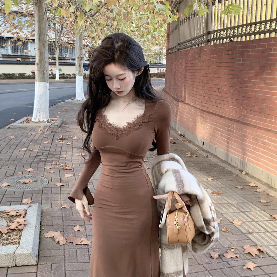 秋季新款长袖拼接鱼尾连衣裙女打底黑色蕾丝收腰修身气质裙子长裙