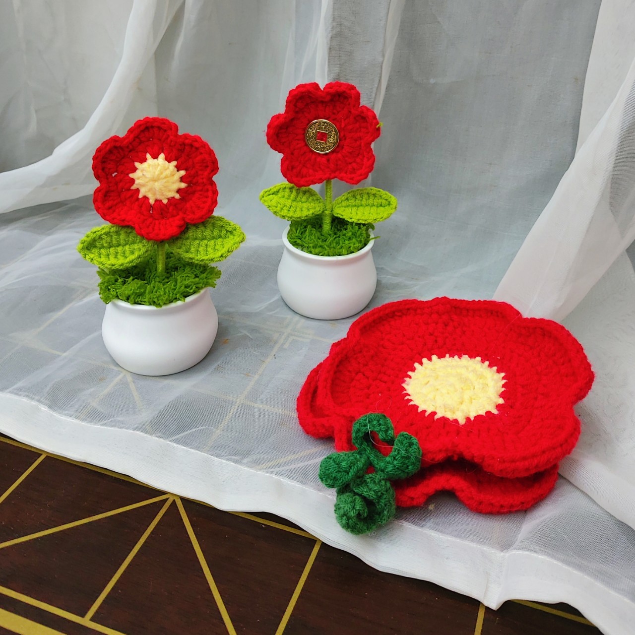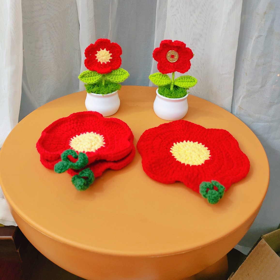小さな赤い植木鉢の完成品,小さな鉢植えにお金をかけて完成品,小さな赤い花のコースター完成品