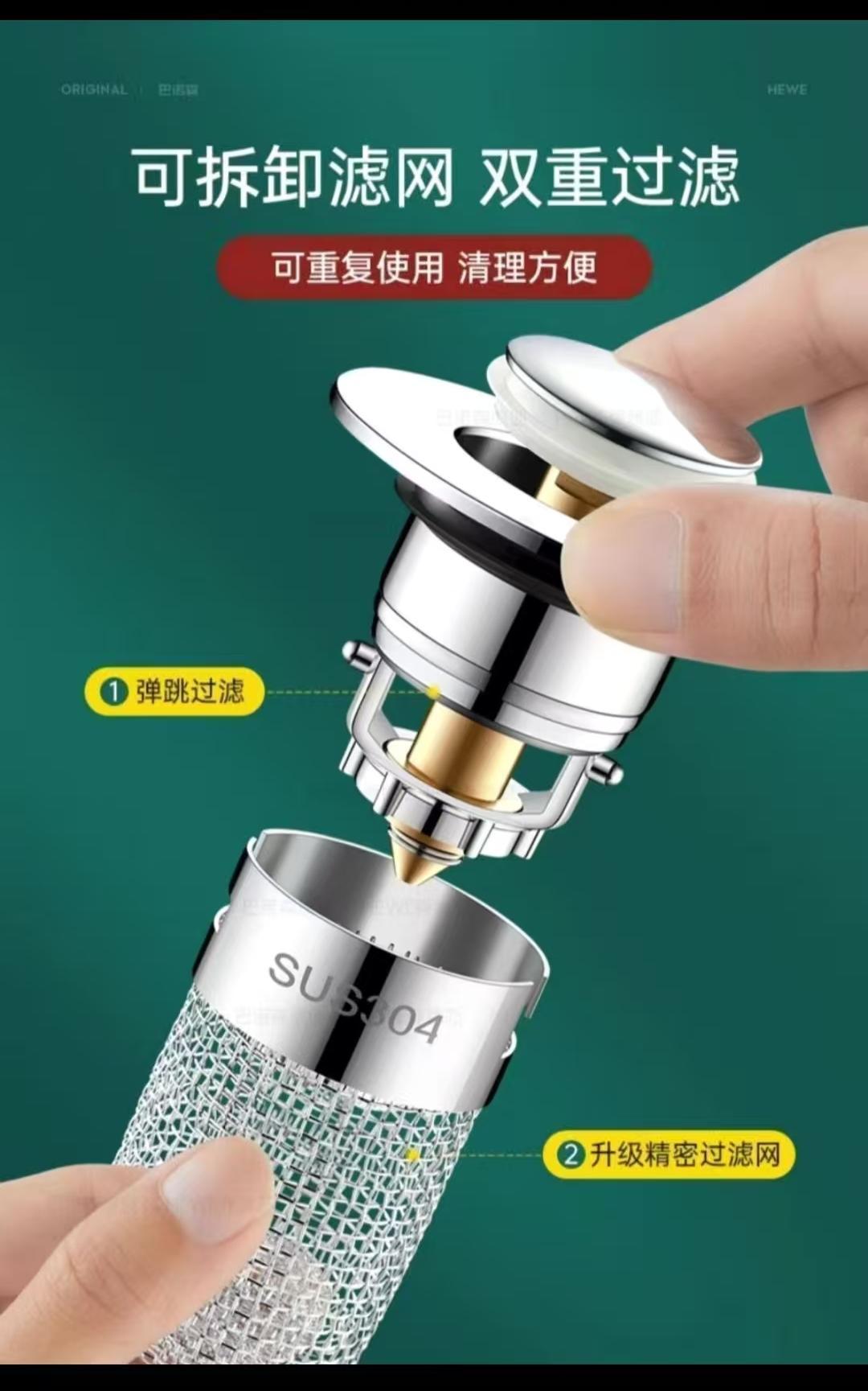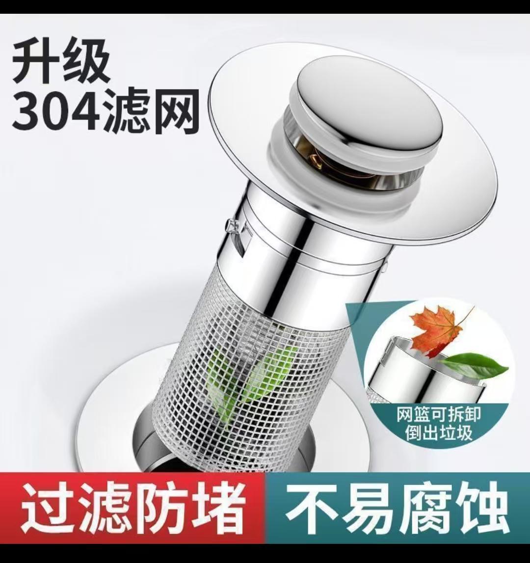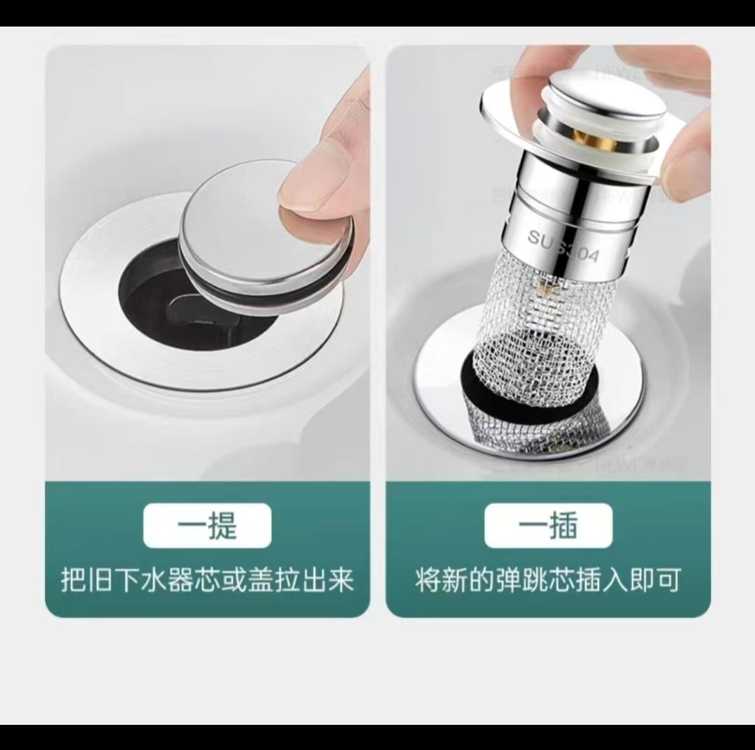 面盆洗手盆通用弹跳芯304不锈钢防臭堵孔塞洗脸盆按压式下水器过