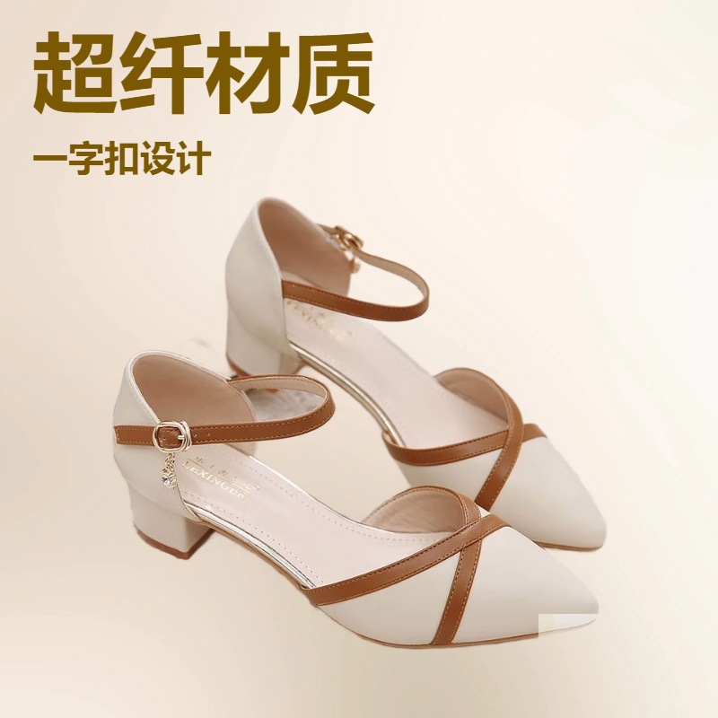 女性用気質サンダル 2025年夏新作 太ヒール ミディアムヒール ソフトレザー ワンラインストラップ 包頭 ファッション婦人靴 ハイヒール