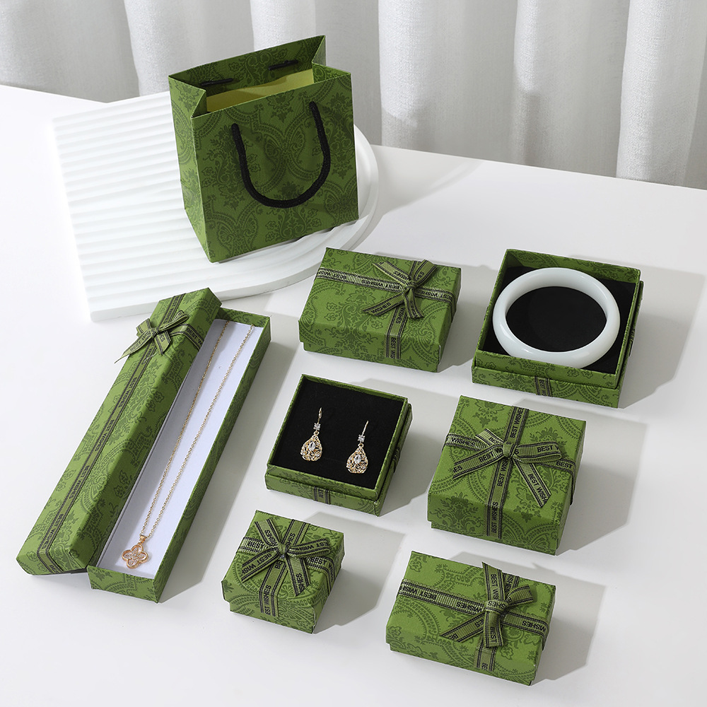 レトロな緑のアクセサリーの箱の蝶結びの天地の蓋の宝石のアクセサリーの箱の耳飾りのネックレスのブレスレットの贈り物の箱の現物