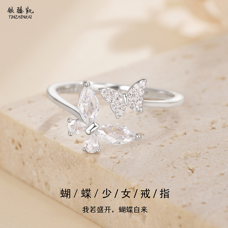 925純銀の蝶の指輪の女性のファッションの個性は口を開けて贅沢な大衆の設計感の食指の高級な指輪を使います。
