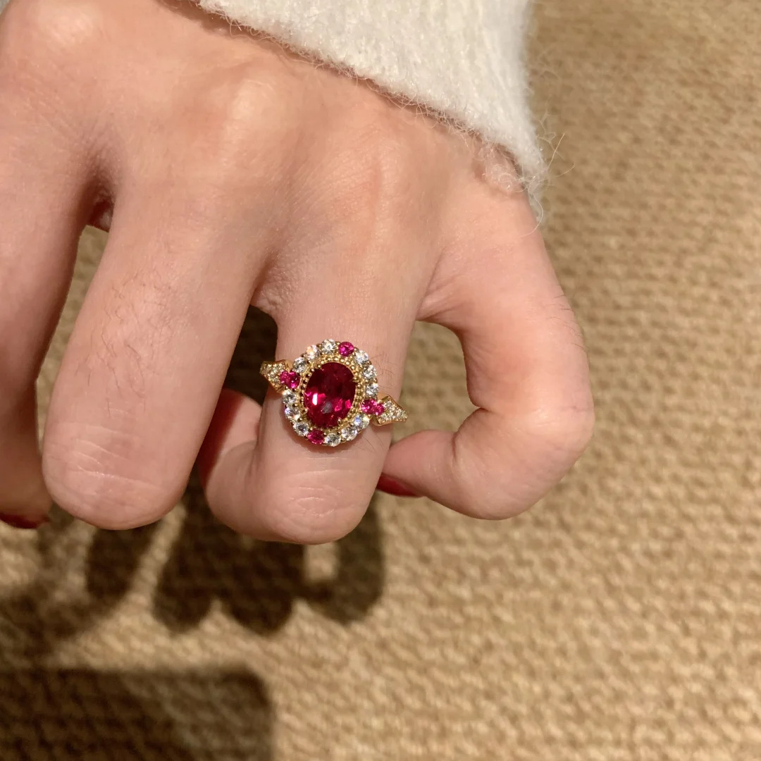 フランスのレトロな経典の擬真のルビーの鳩の卵の指輪の新年の中国の赤い金メッキのダイヤモンドの指輪の女性の指輪