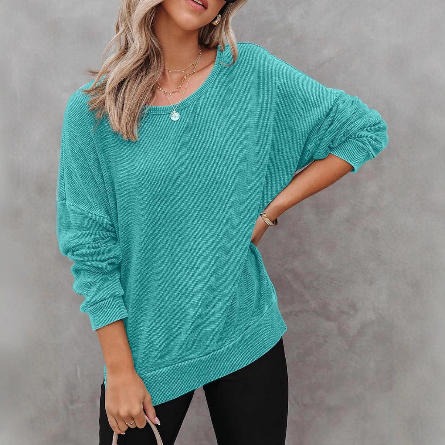 2025欧美跨境女装 亚马逊秋季新款圆领长袖侧开叉华夫格卫衣T恤女