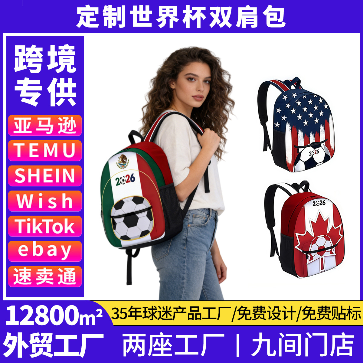 跨境美加墨2026世界杯国旗元素足球印花双肩包观赛球迷用品书包