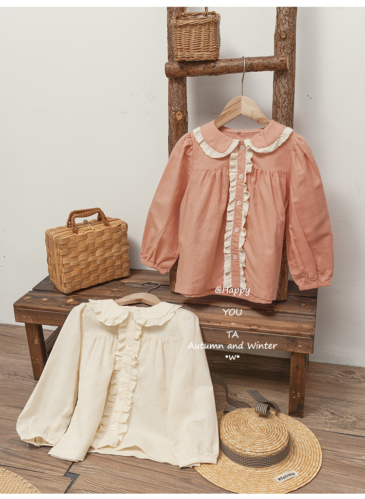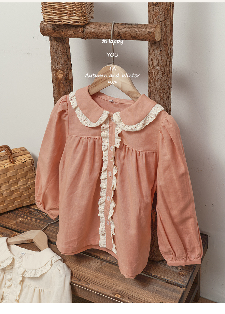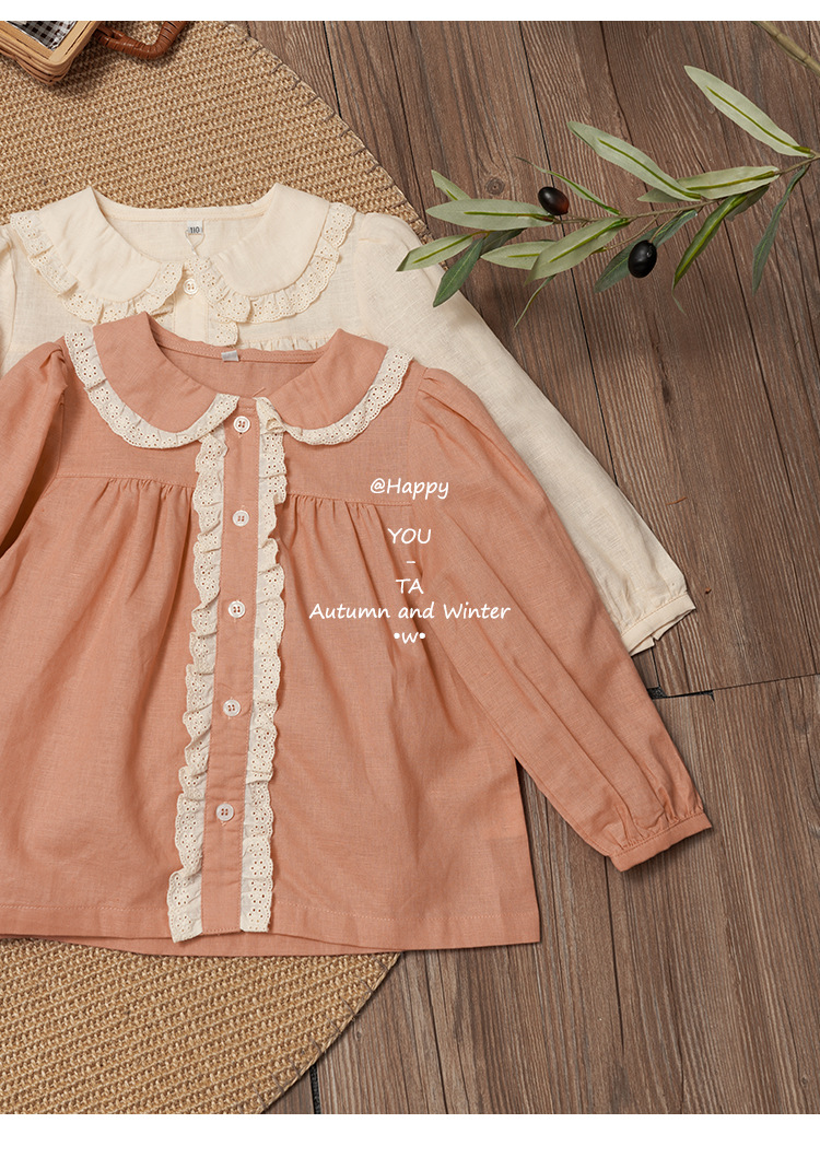 子供のコントラストカラーラペルベビードールシャツ 25 春と秋のデザインレースステッチ子供シャツパフスリーブ日本トップ