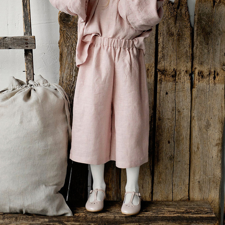 女の子服北欧スタイル綿とリネンワイドレッグパンツカジュアルクロップドパンツ女の子ベビーリネン無地ウエストゴムパンツ