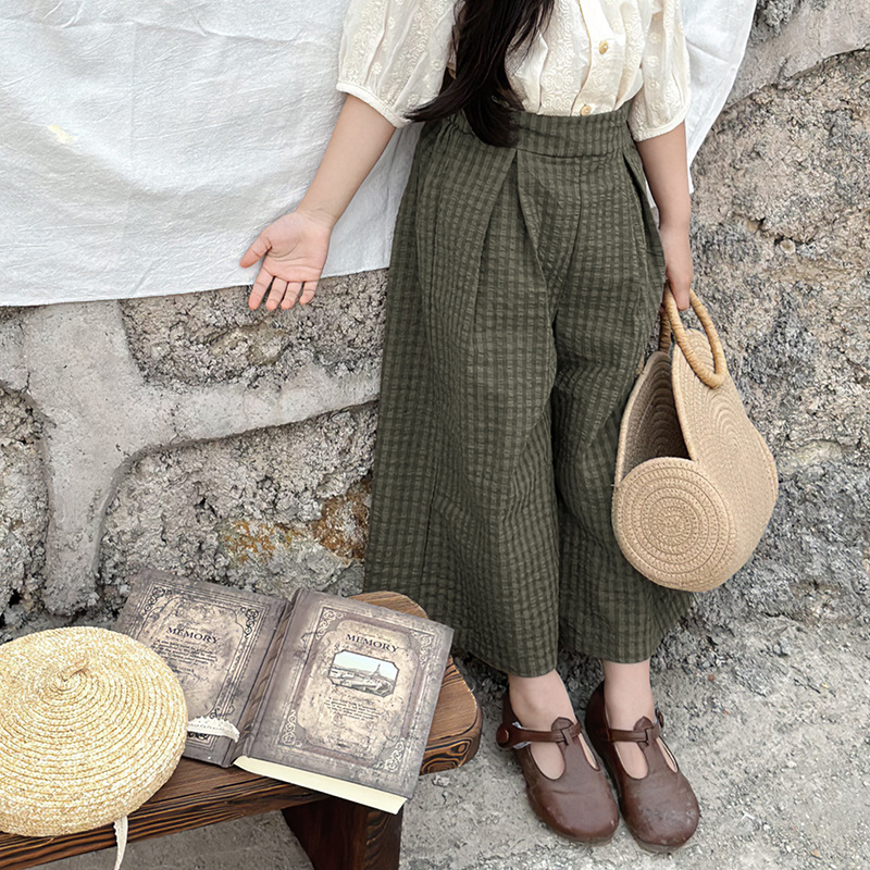 女の子服、森風綿麻サスペンダーパンツ、秋麻綿サスペンダーパンツ、ガーリー風パンツ、ベビーチェック柄ワイドパンツ
