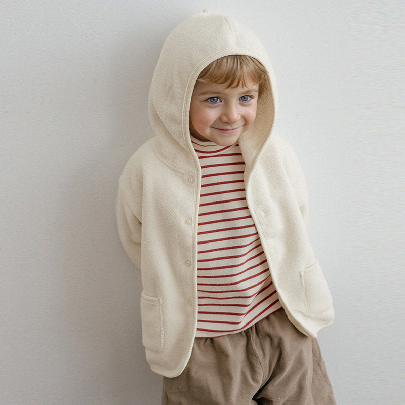 無地フード付きジャケット 2025年秋冬新作 韓国風 保温性のある子供服 隠しボタン開襟 長袖ポーラーフリースカーディガン