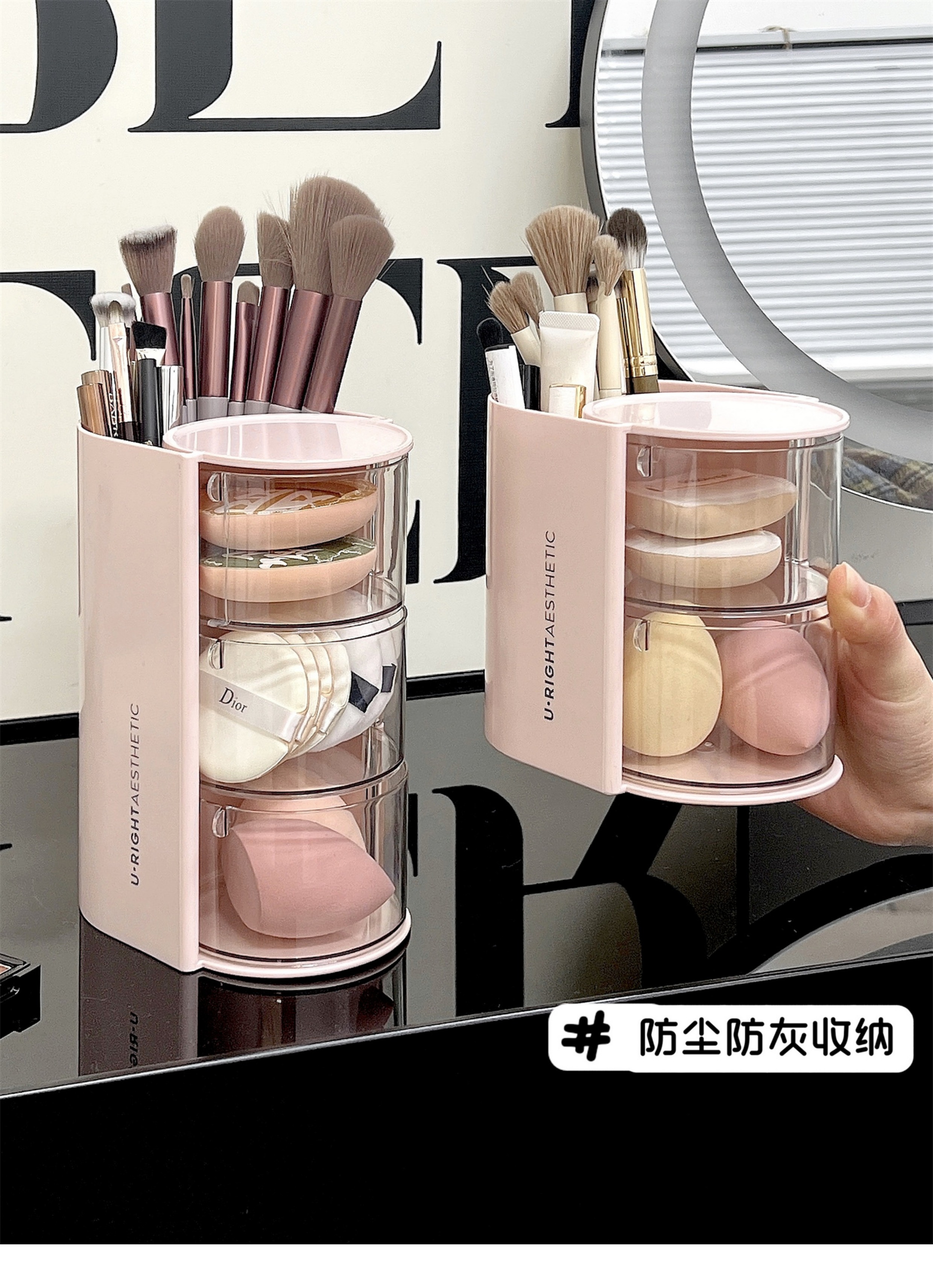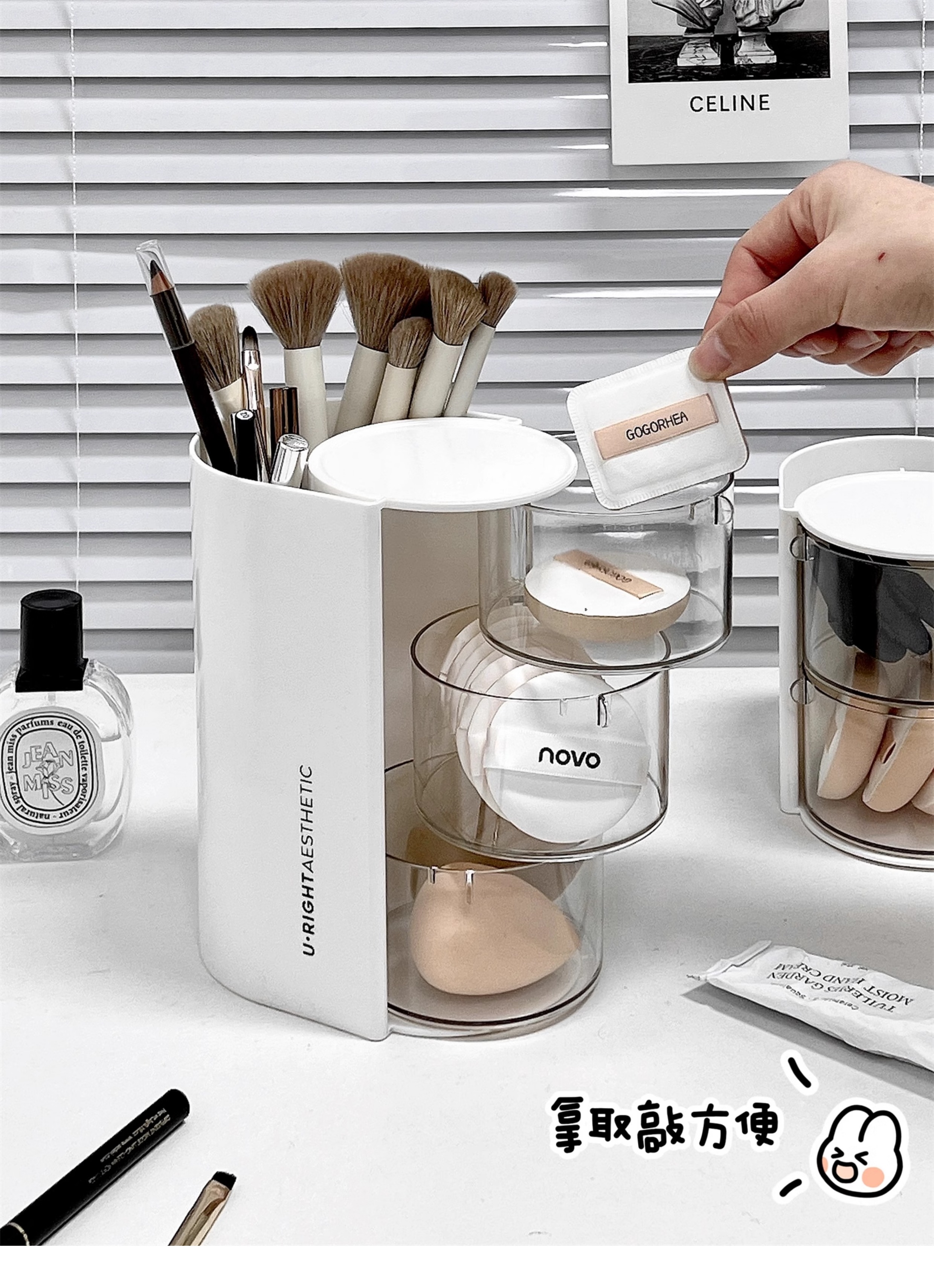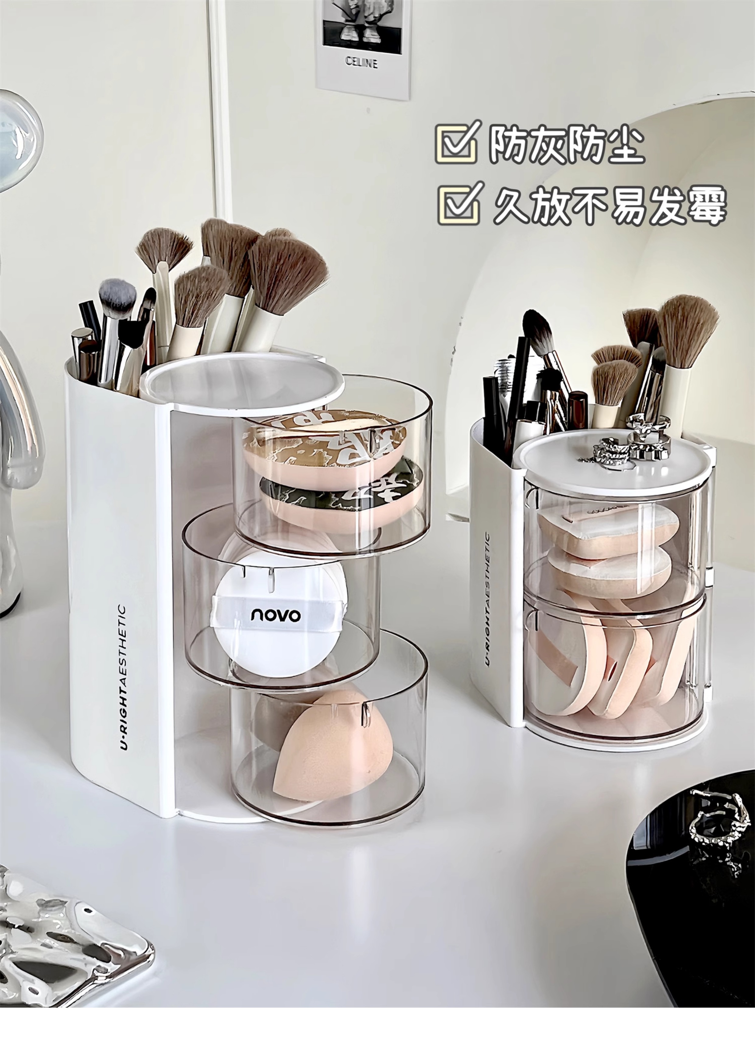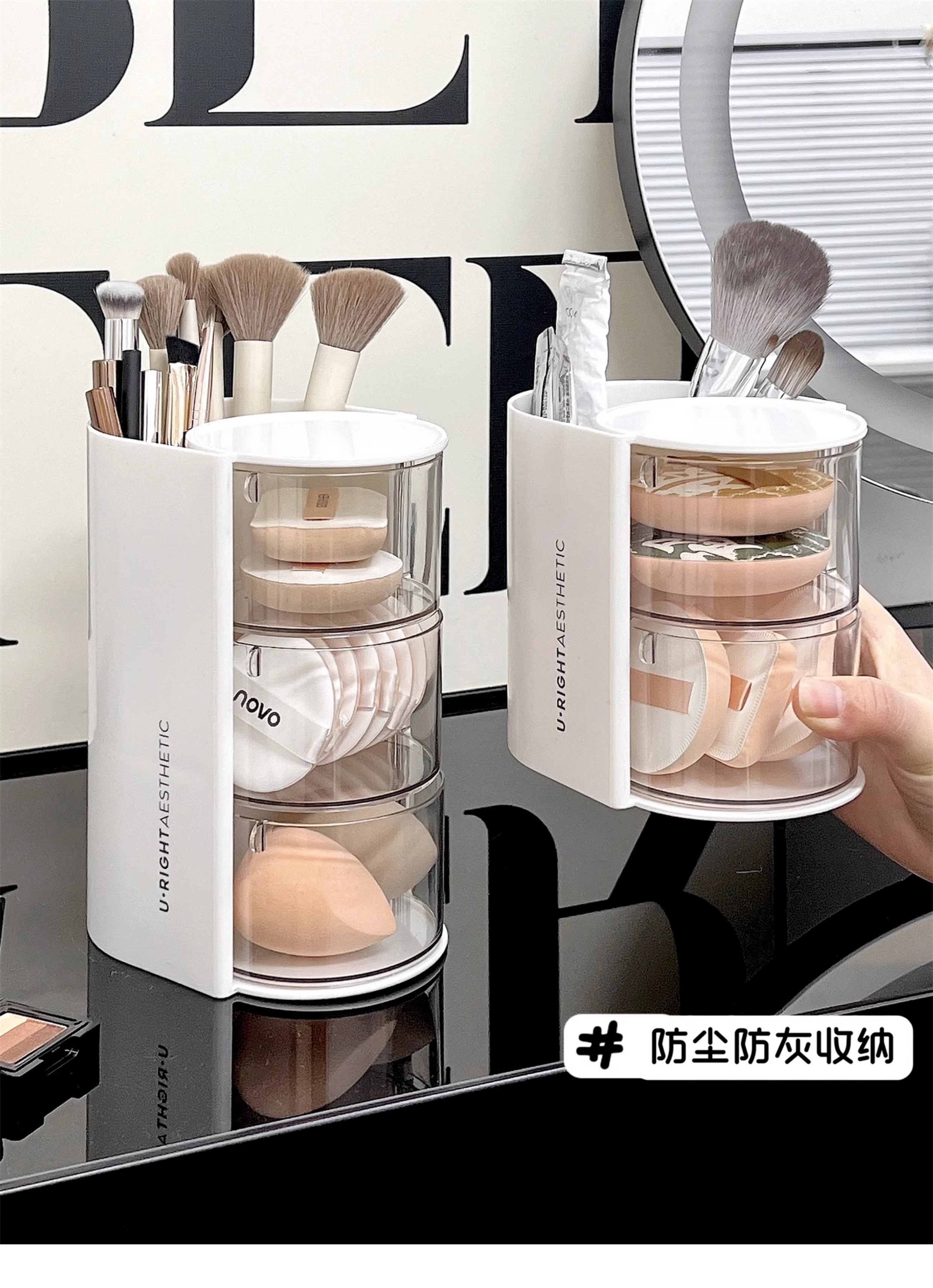 粉扑收纳盒旋转防尘梳妆台桌面美妆蛋气垫口红化妆刷收纳筒置物架