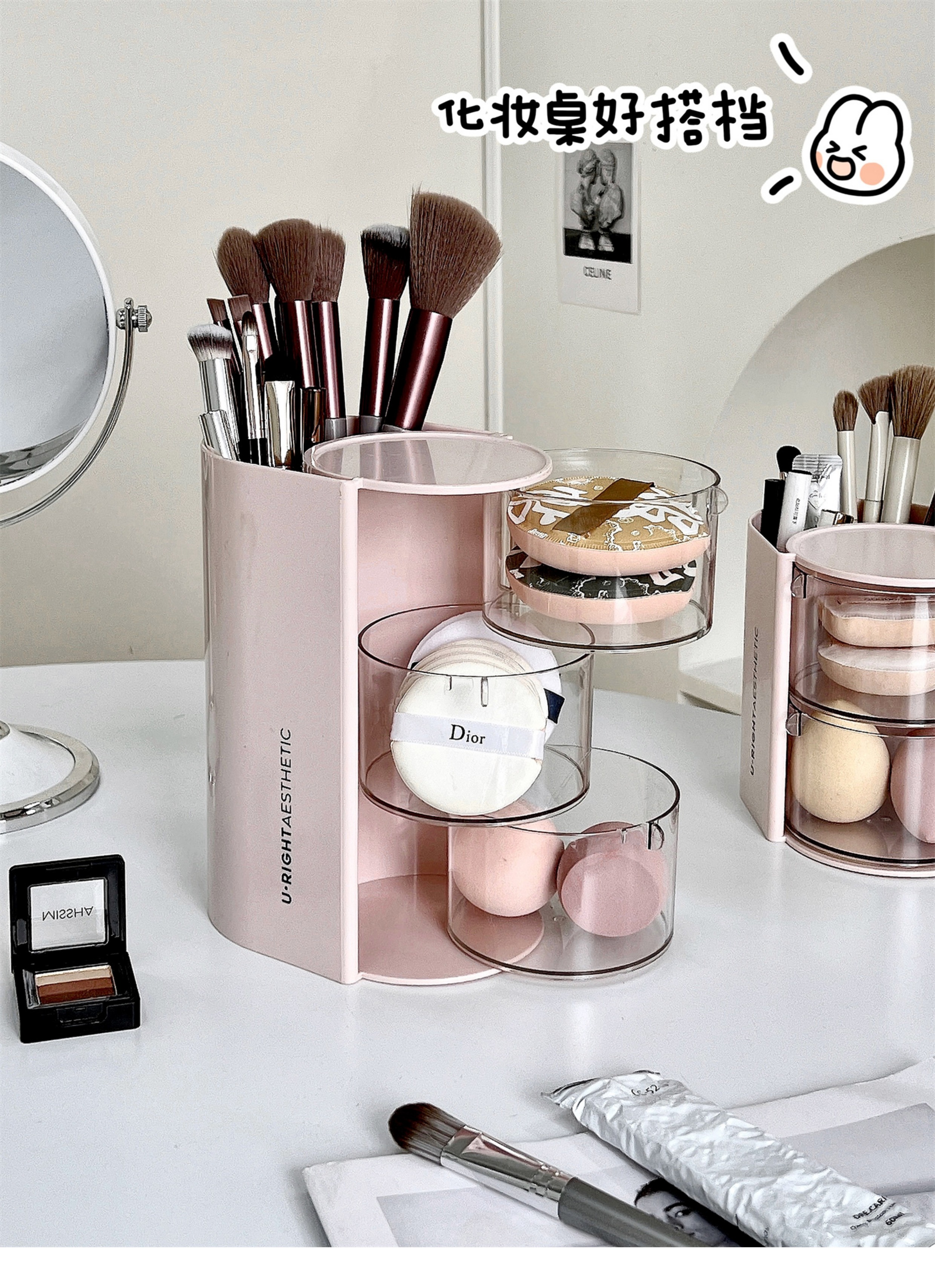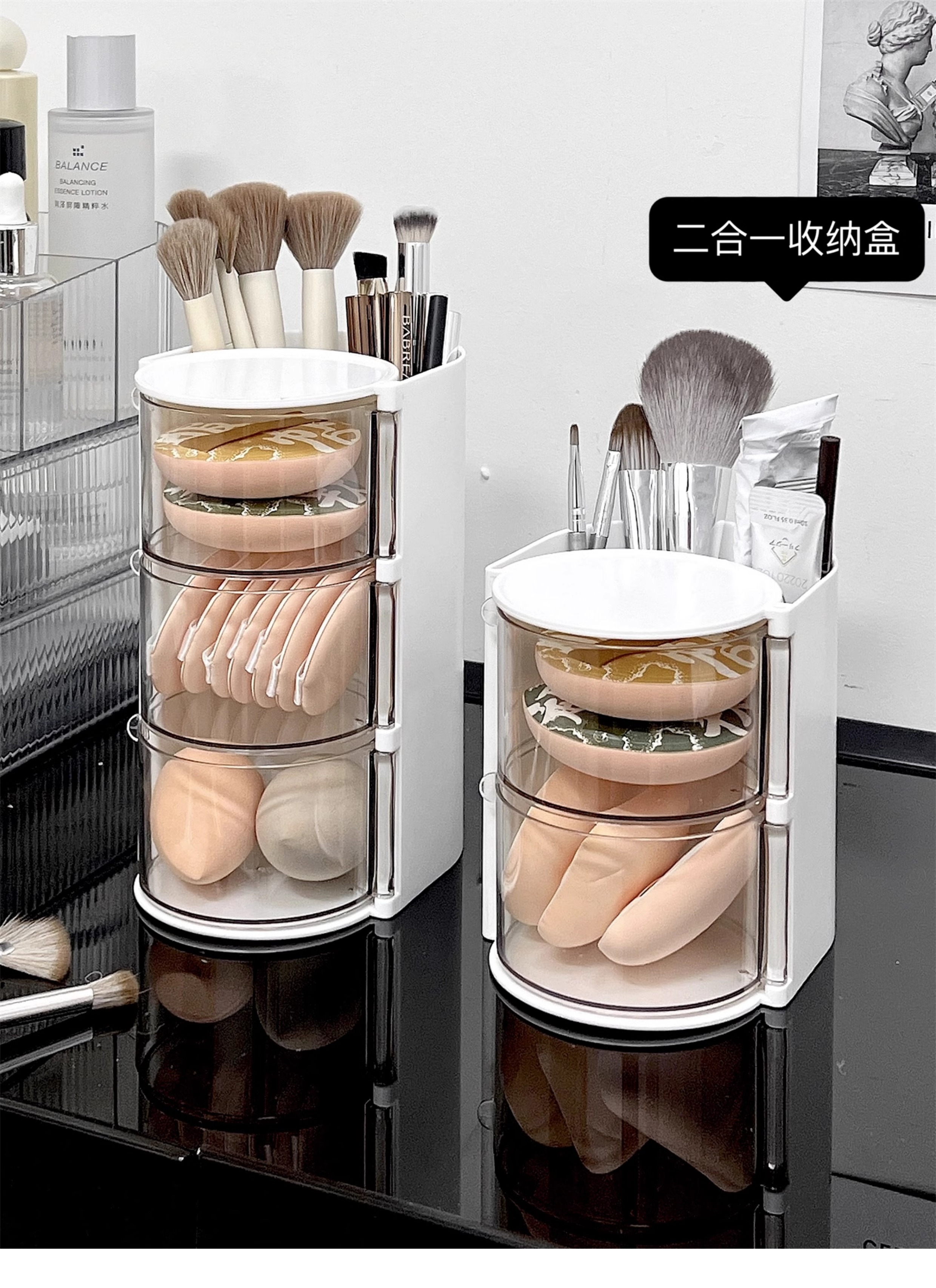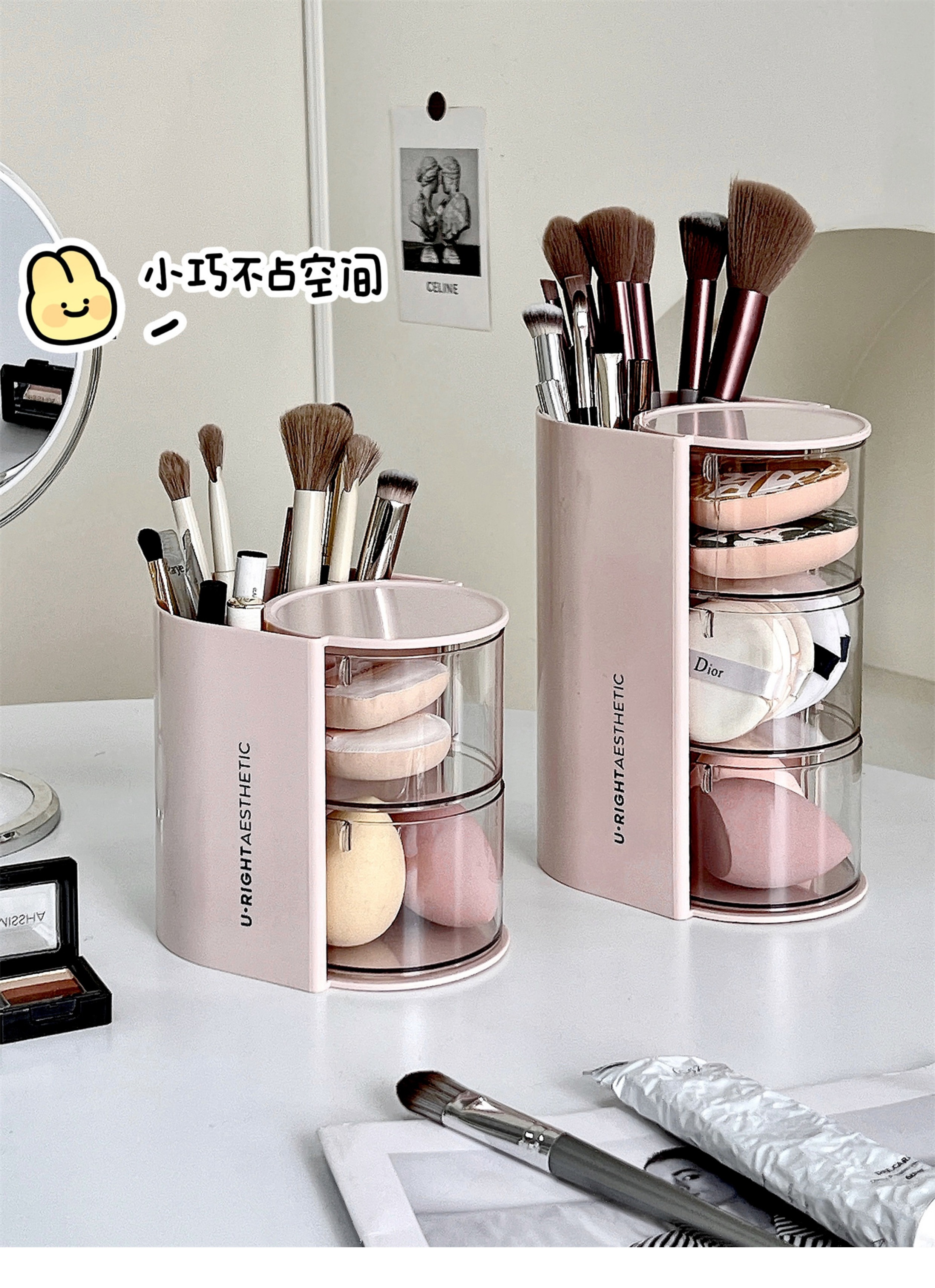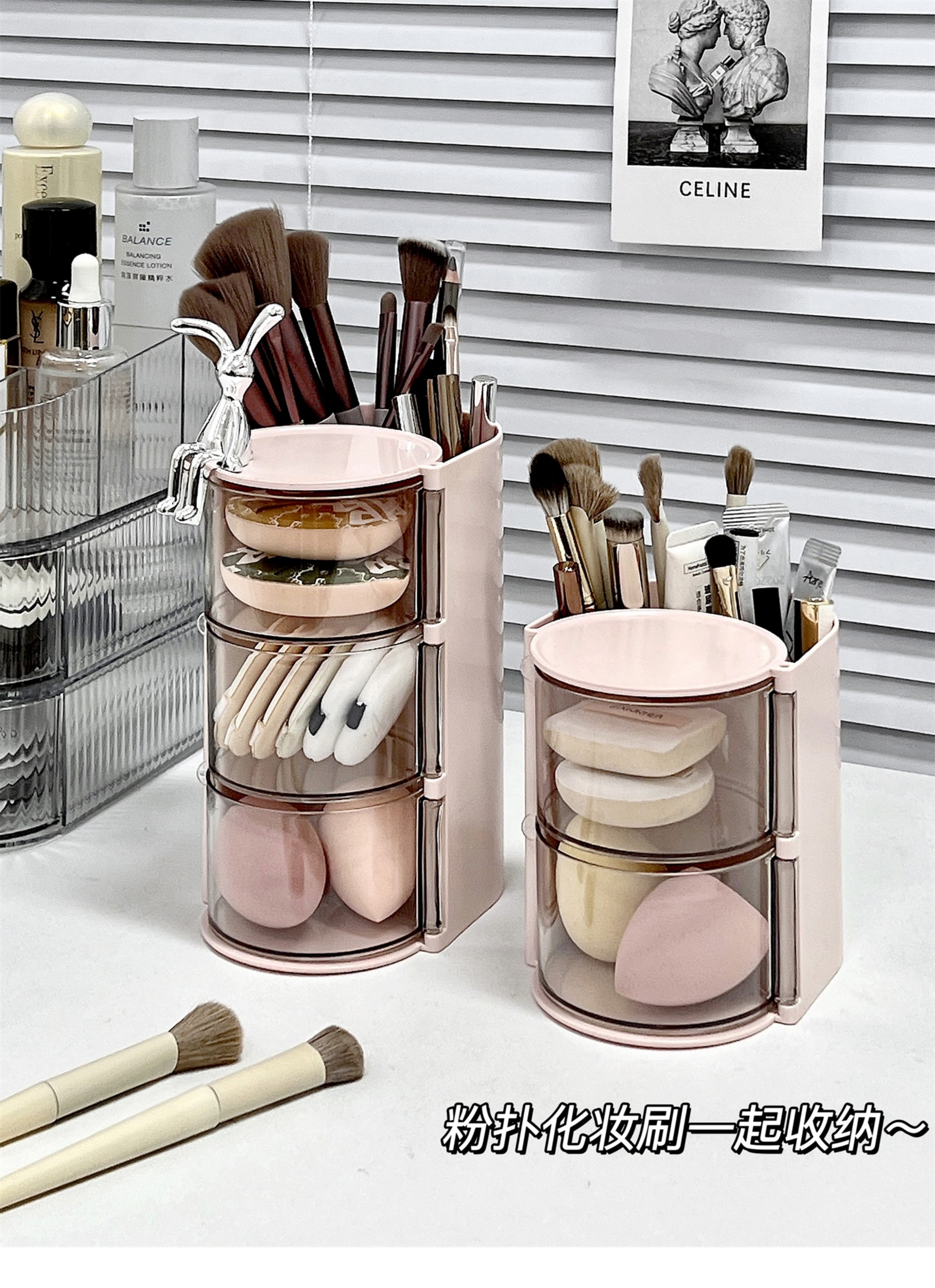 粉扑收纳盒旋转防尘梳妆台桌面美妆蛋气垫口红化妆刷收纳筒置物架
