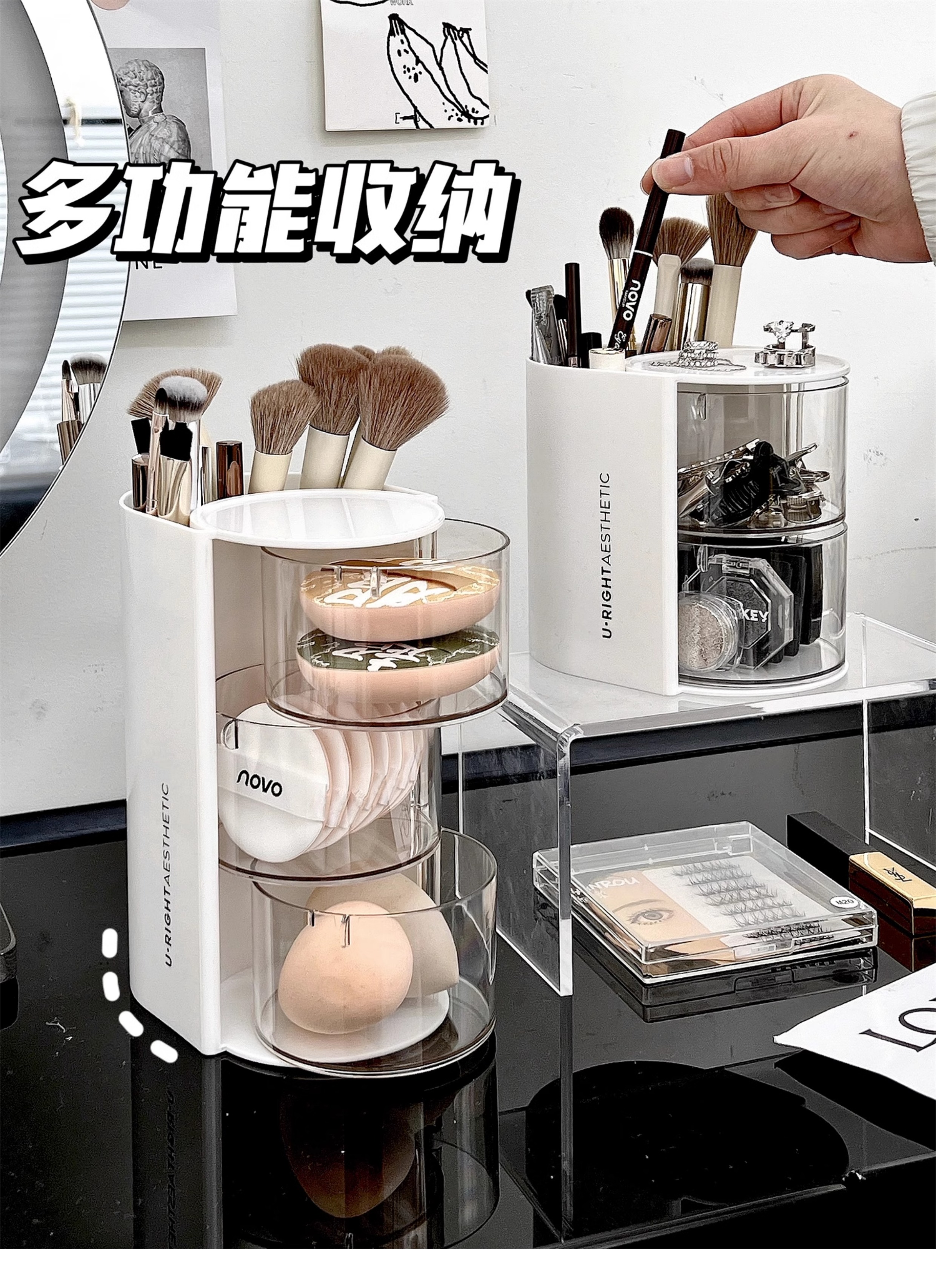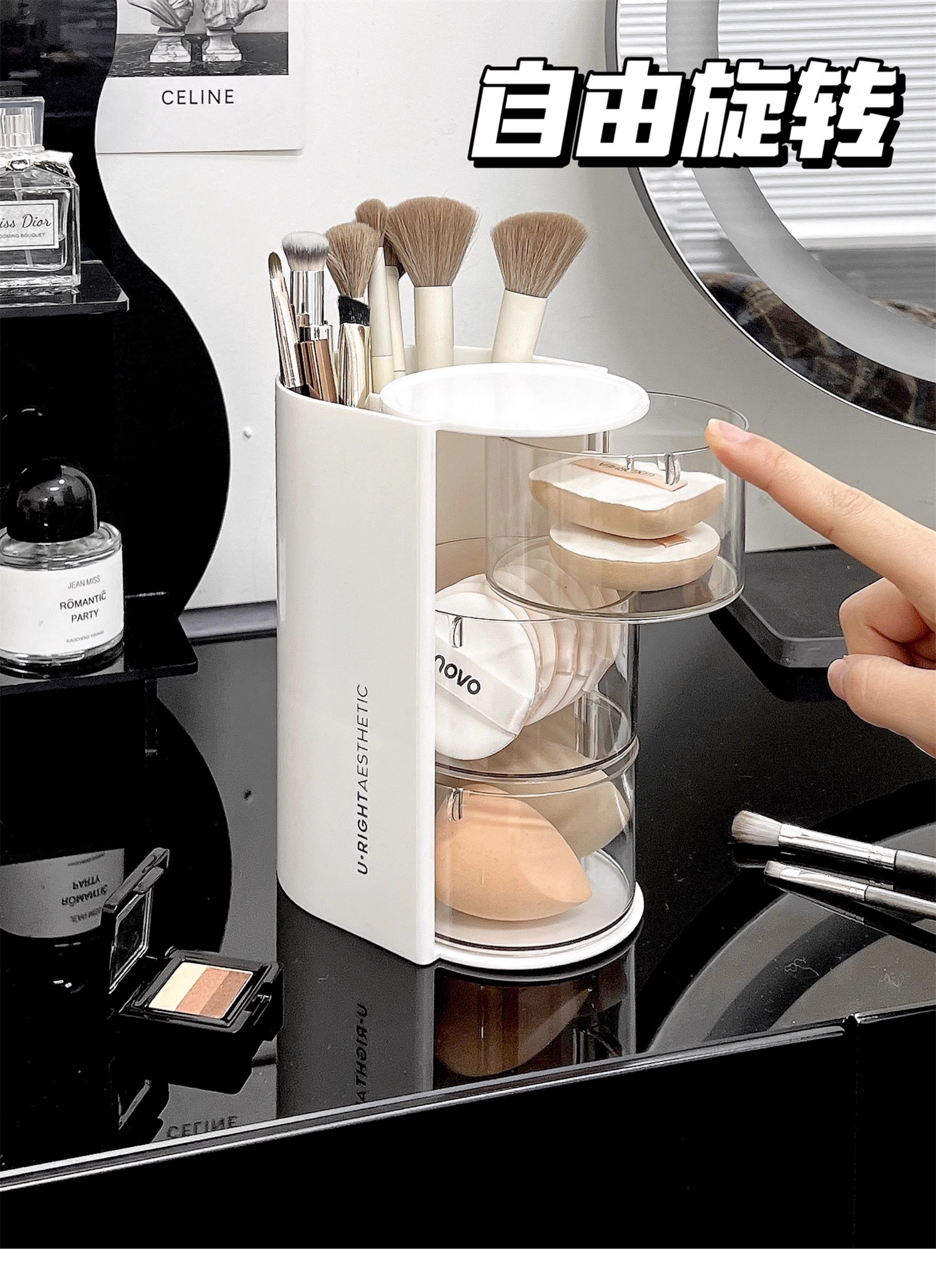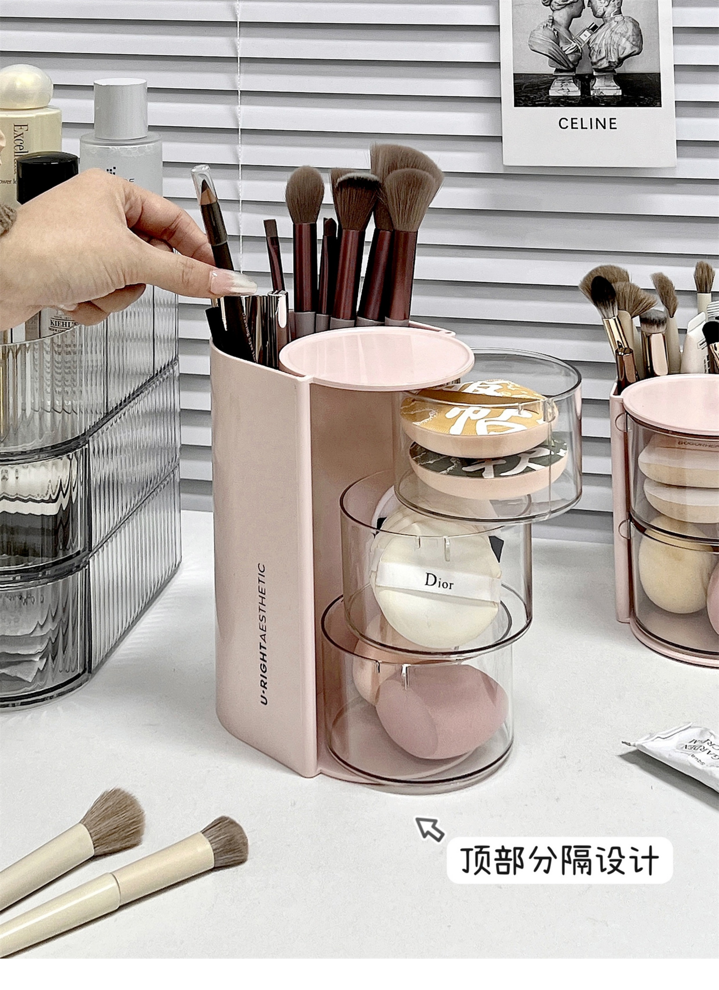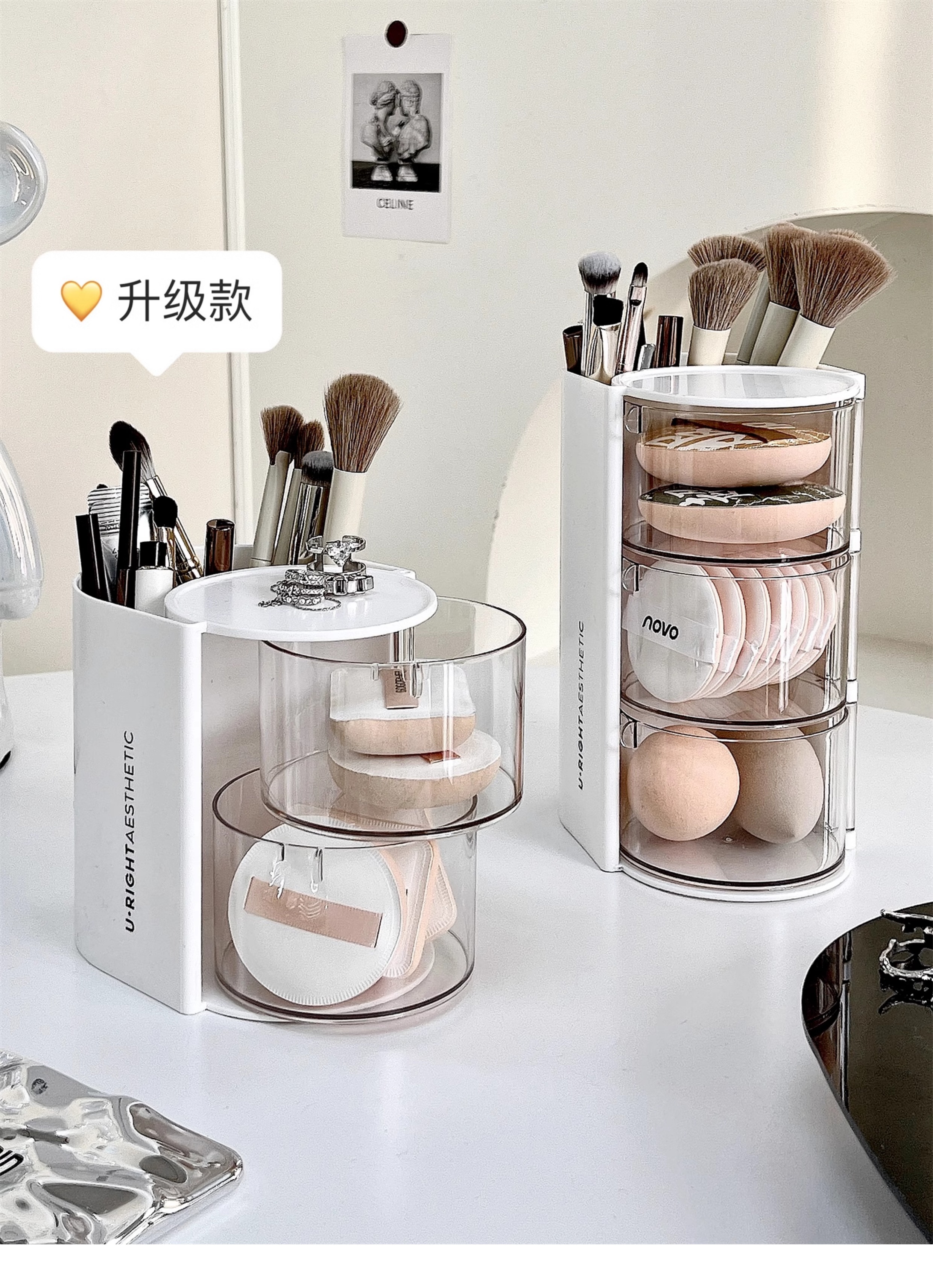 粉扑收纳盒旋转防尘梳妆台桌面美妆蛋气垫口红化妆刷收纳筒置物架