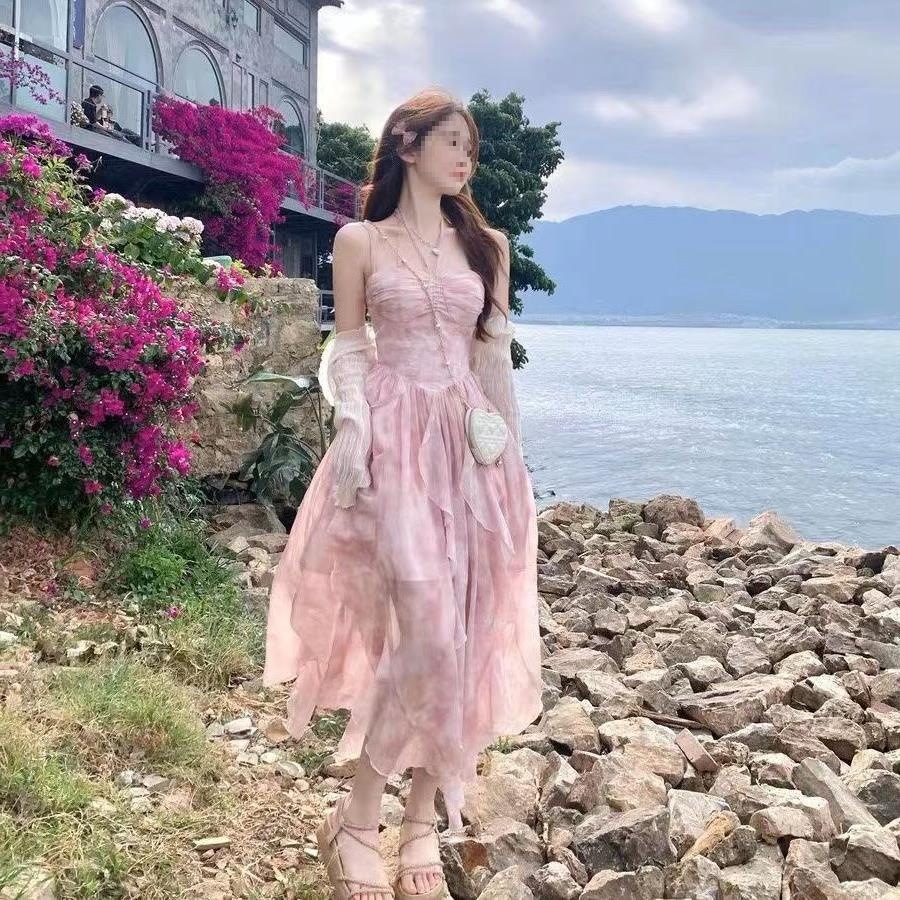 砕花ストラップスカートアンドロメダ風ぼんやりした色柄の不規則な裾のリゾートビーチストラップ純欲風ワンピース