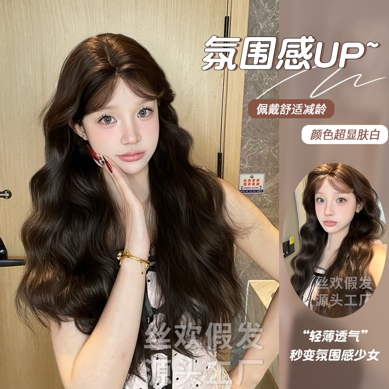 糸歓クロスボーダー卸売りかつら日常黒茶色ロングカール八字前髪自然真実全頭カバー式