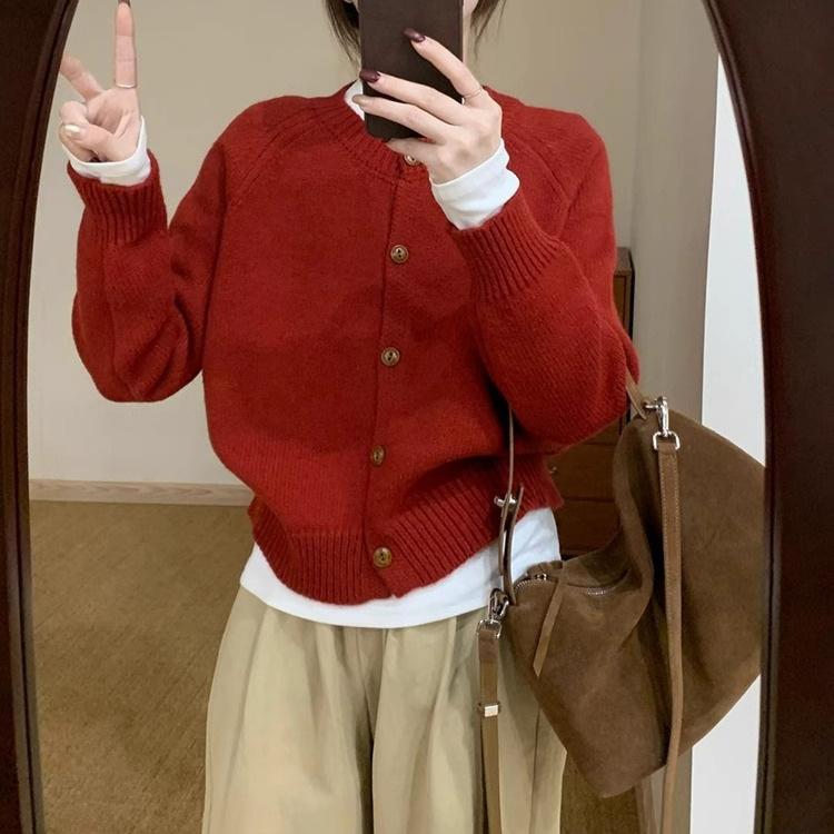高级感气质短款红色针织开衫女秋冬季慵懒风软糯毛衣外套洋气上衣