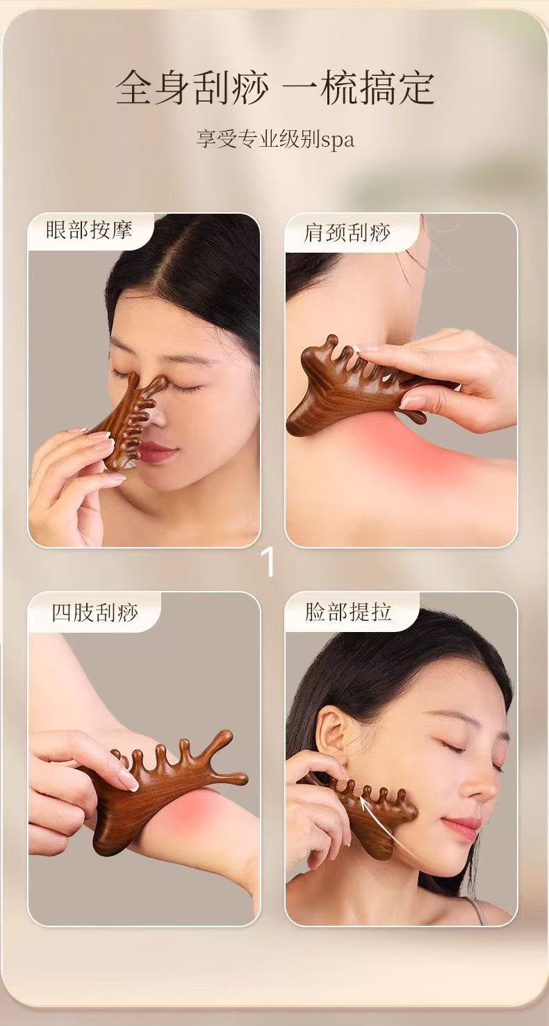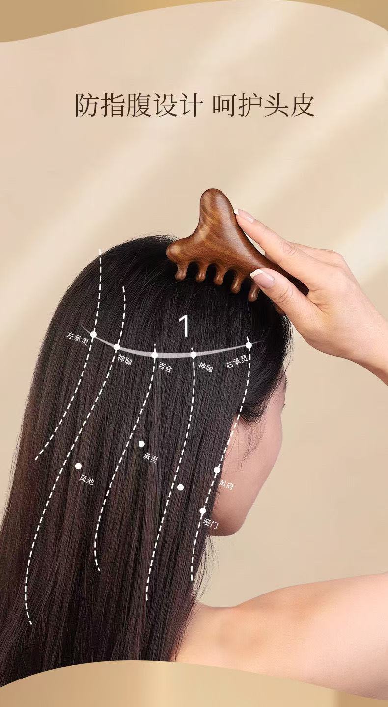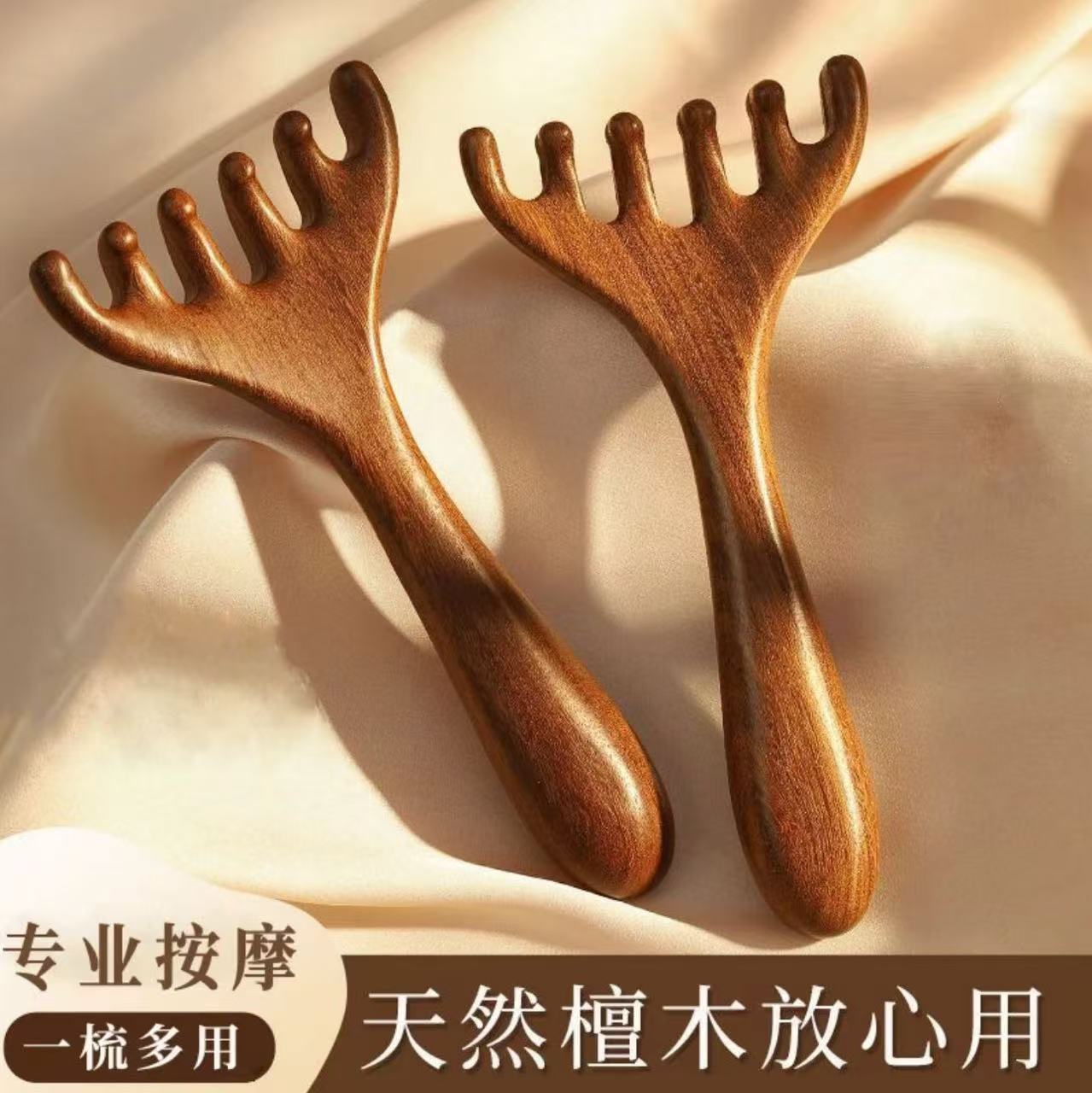 4-in-1 頭皮マッサージコーム、頭の脱毛、頭の治療、経絡のスクレーピング、顔と目の白檀コーム