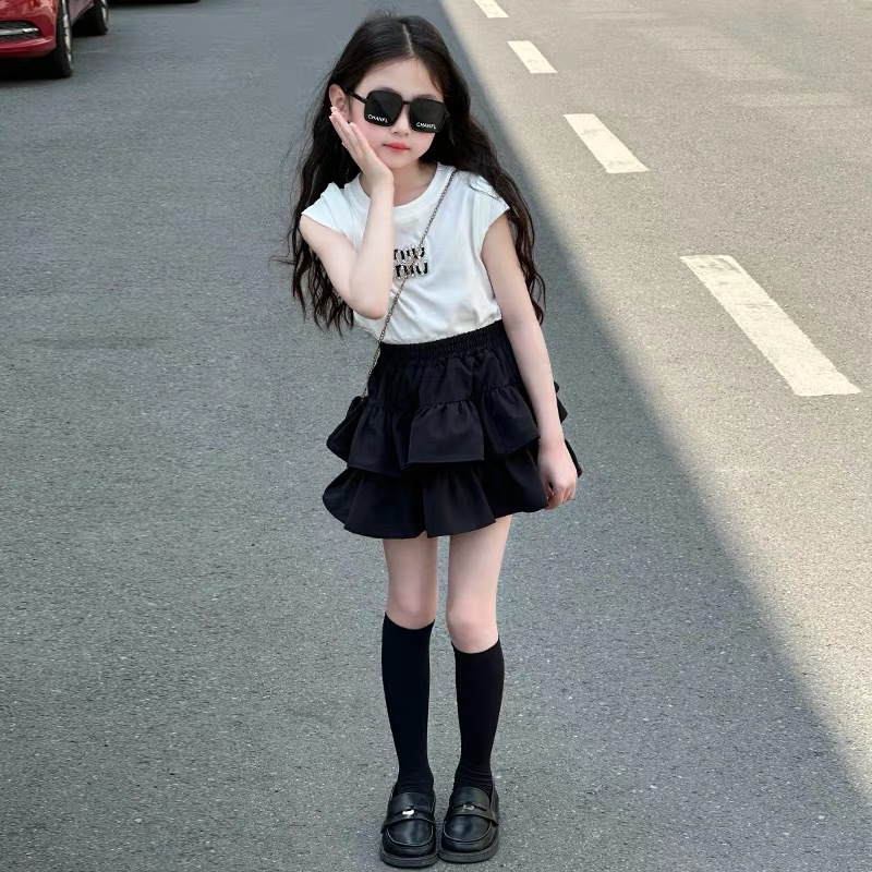 女の子純綿半袖Tシャツサマースーツ2025新スタイルリボン中大型子供用ケーキスカート2点セット