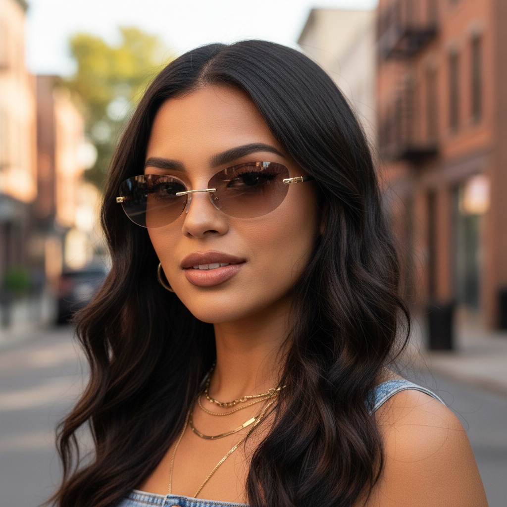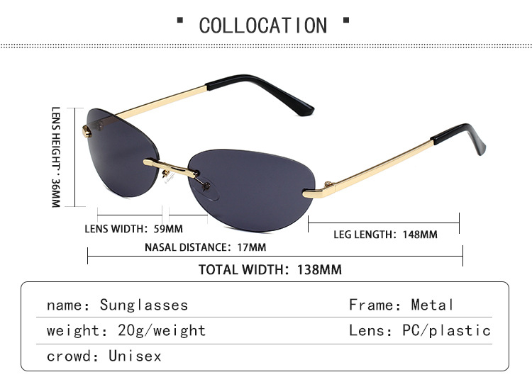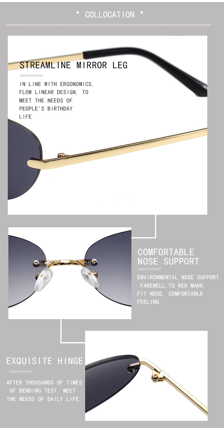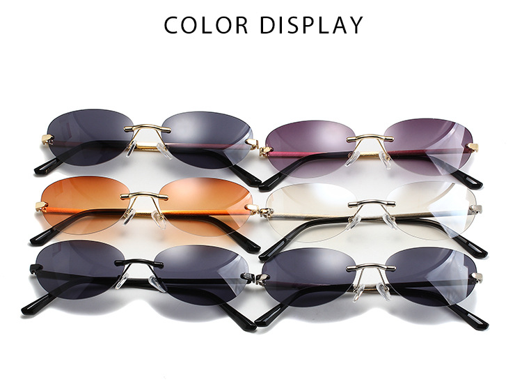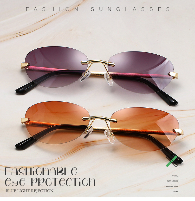 雰囲気のあるメタルフレームレスサングラス、ファッショナブルな楕円形フレームカットエッジ装飾サングラス、新しい抗UVメガネ
