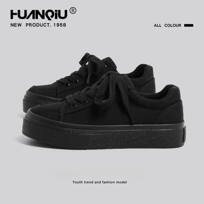 黑色厚底帆布鞋女春季新款百搭圆头网红爆款松糕增高休闲板鞋