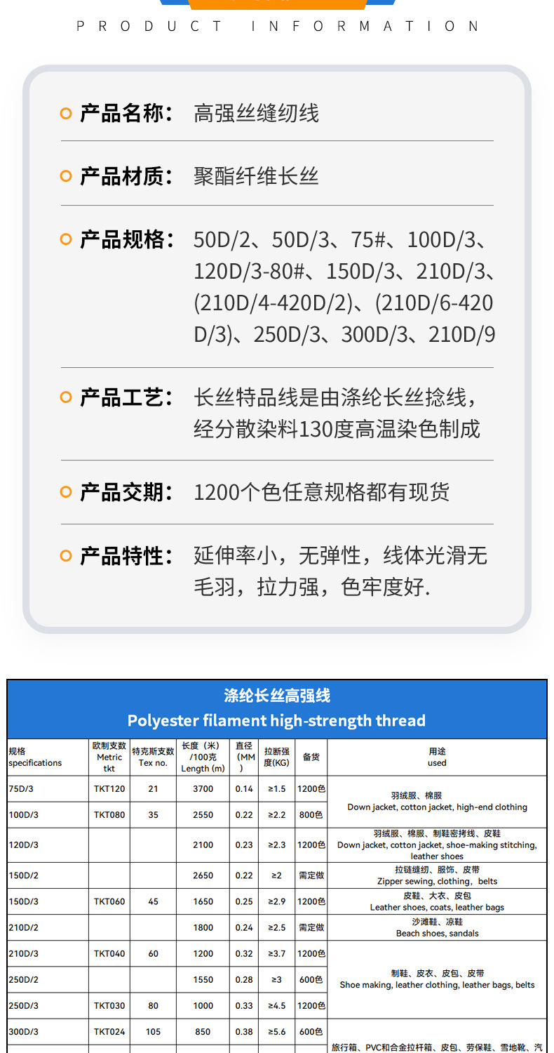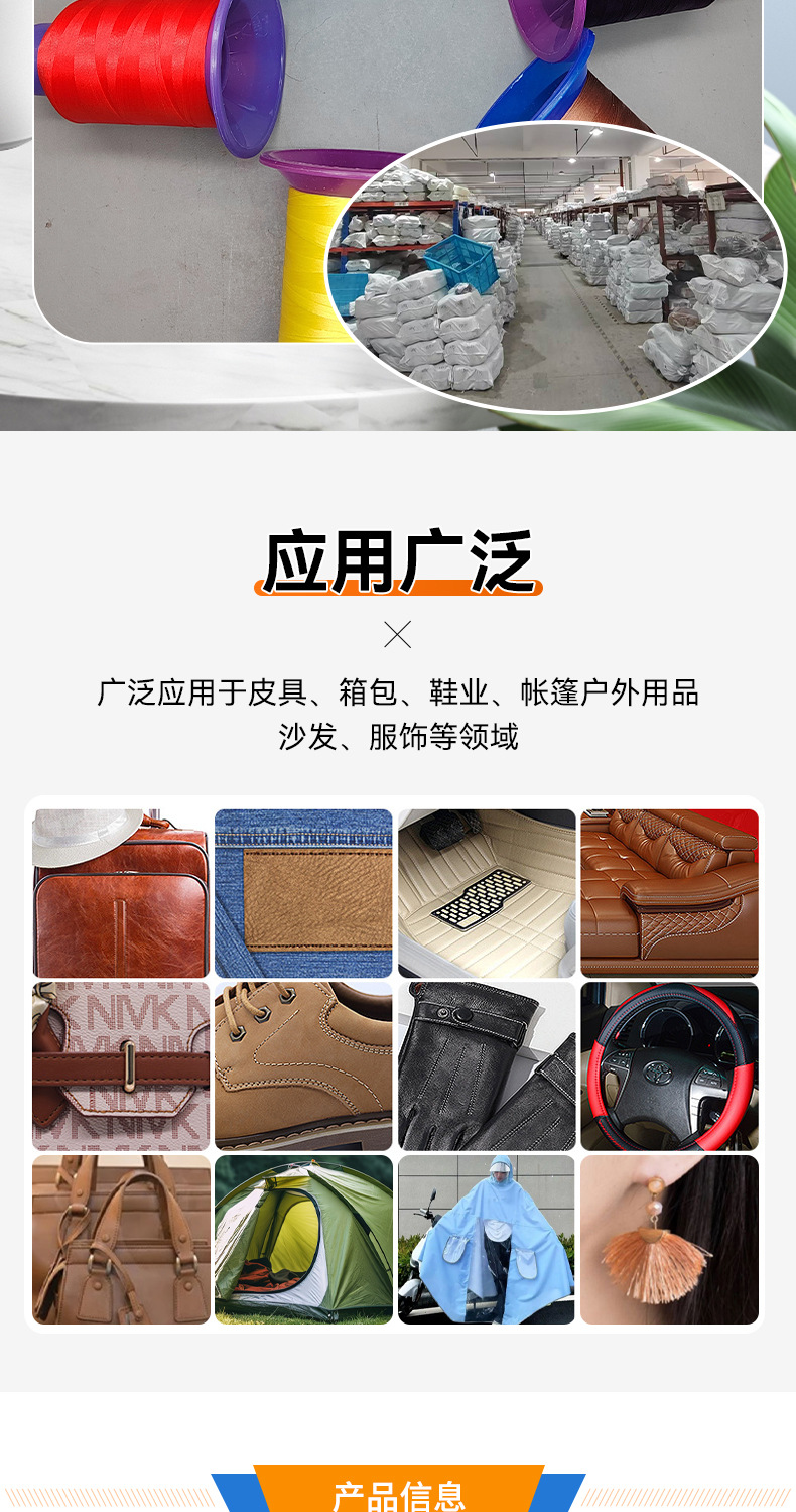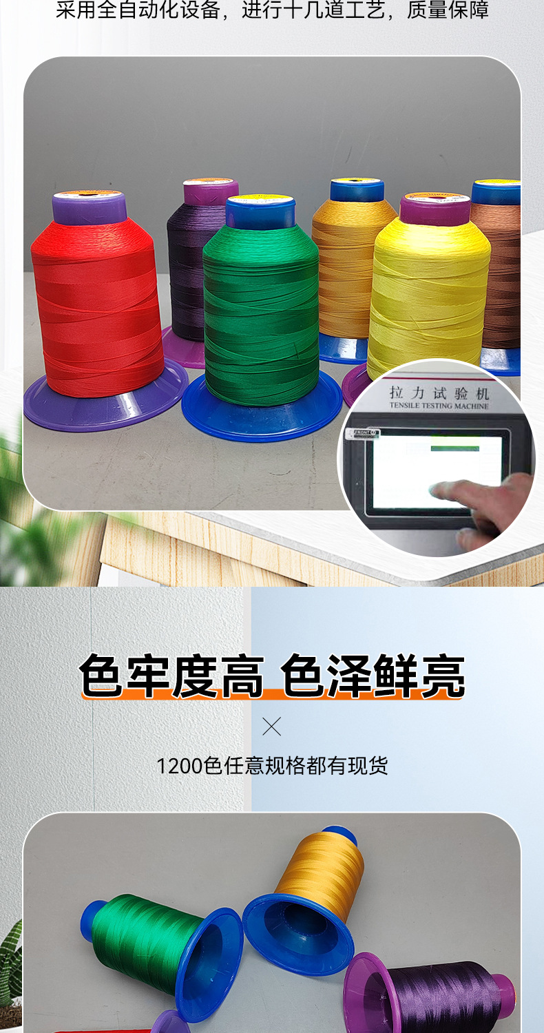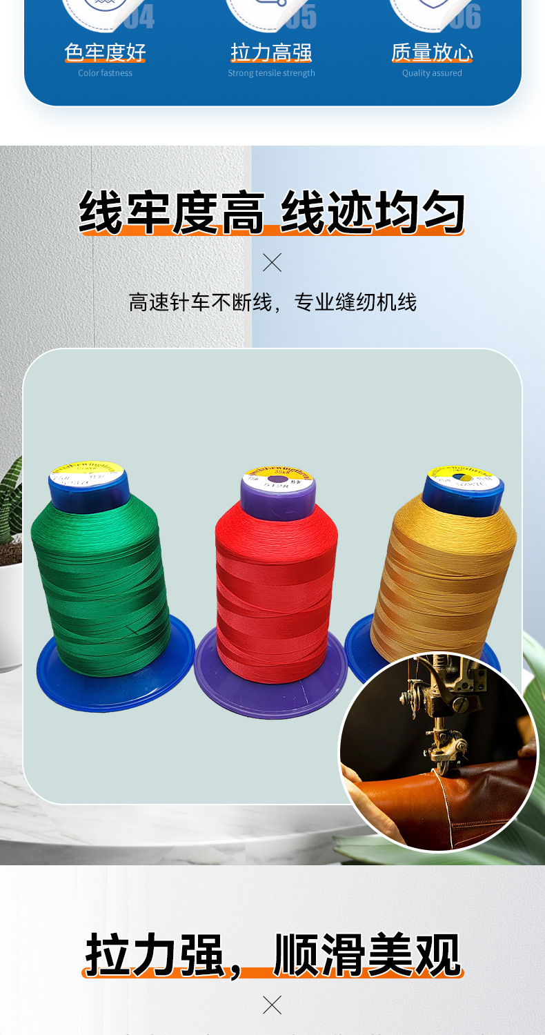 トレインヘッド百針工場は、高強度シルク縫い糸、衣類、テント用150D/3丸頭ベルト・革靴用糸を供給しています。