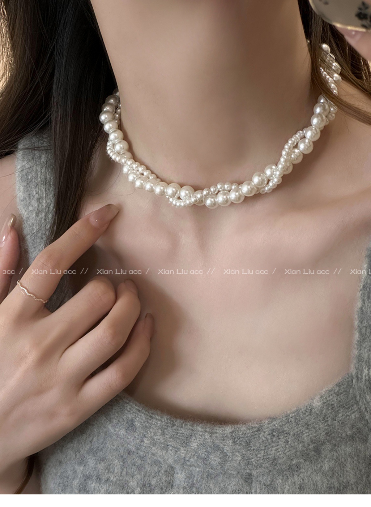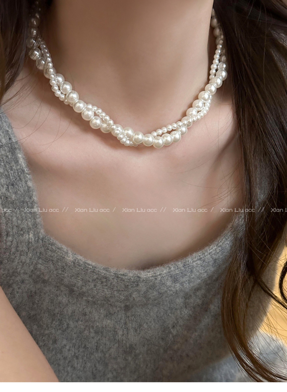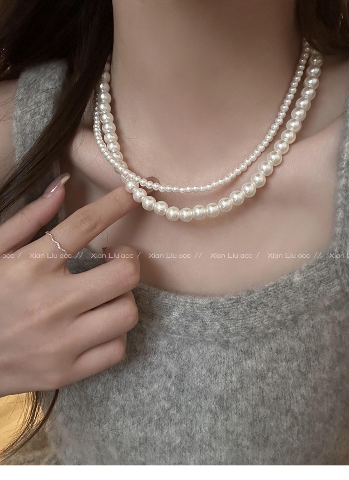 二重に真珠のネックレスを巻いて女性を飾っています。