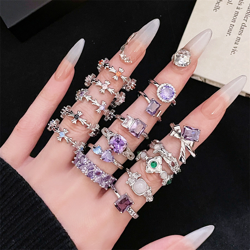 ファッションカラーの宝の開口の指輪の小さい大衆は紫色のジルコンを設計してダイヤモンドの優雅で軽い豪華な女性の復古の十字の指輪を入れます。