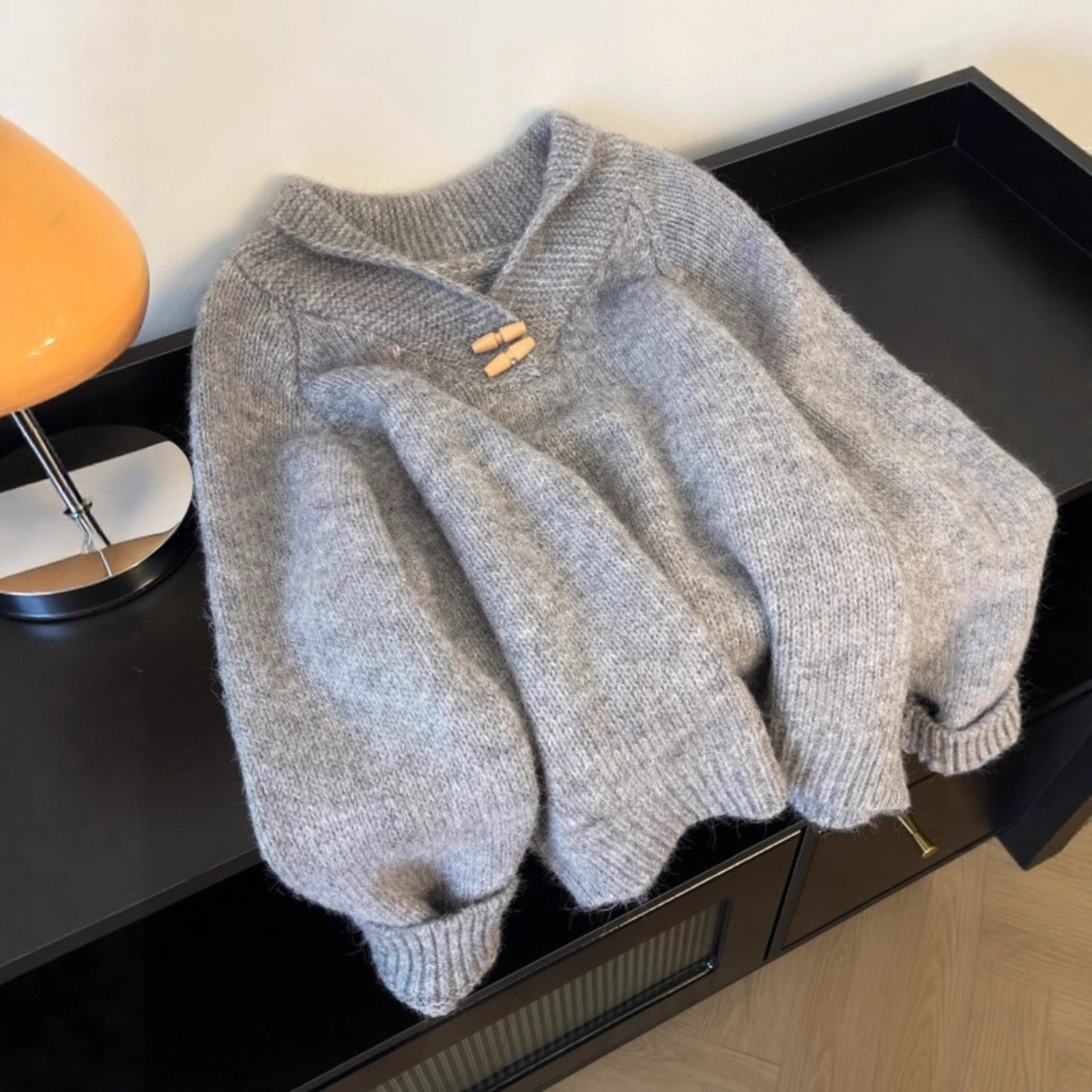慵懒风牛角扣灰色翻领毛衣女早春装大码胖mm插肩袖正肩显瘦针织衫
