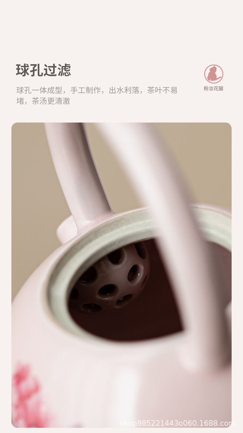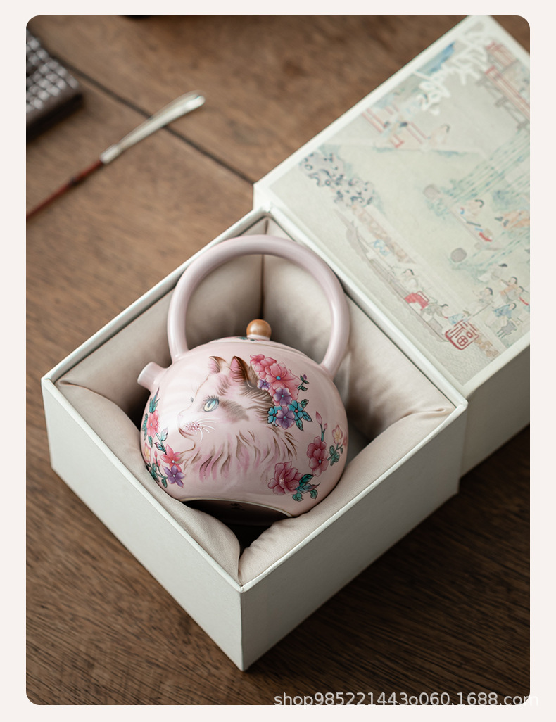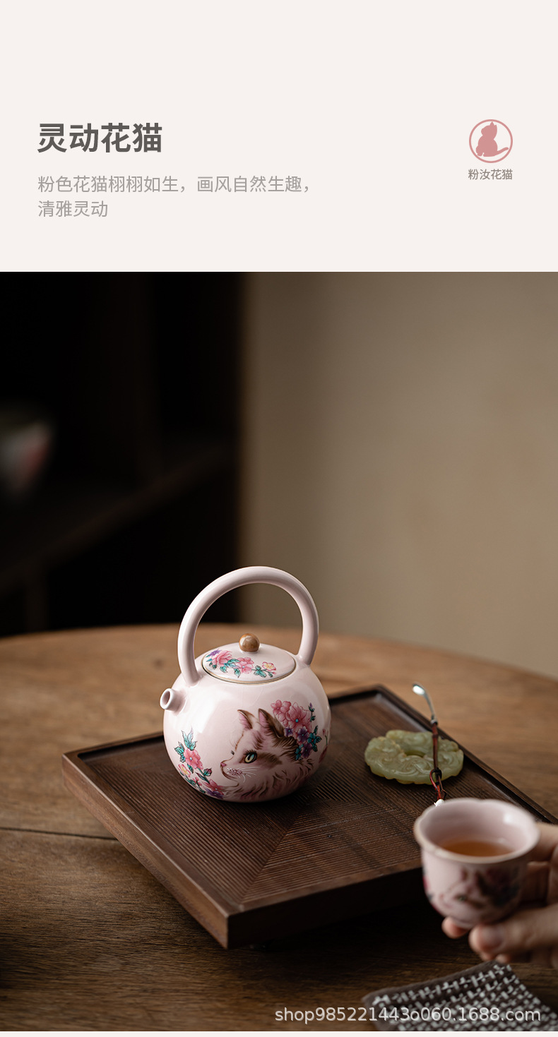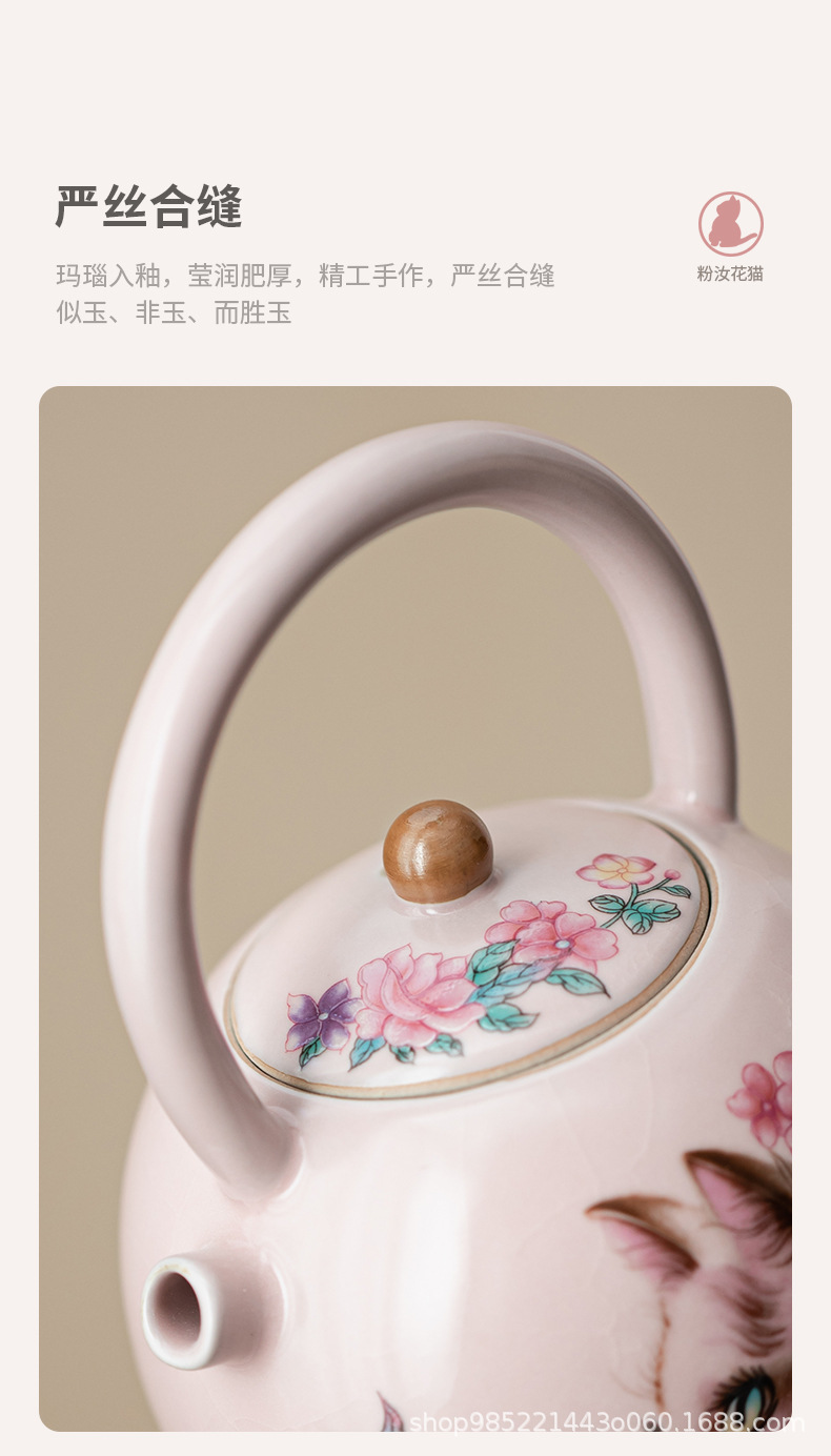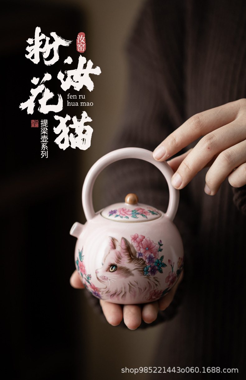 汝窯ピンク花猫陶磁器ティーポット家庭用プレゼント屋外ティーポット工夫手抽出ティーポット誕生日プレゼント