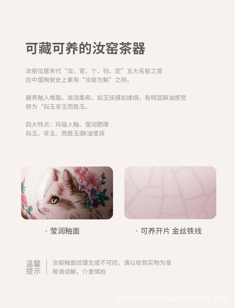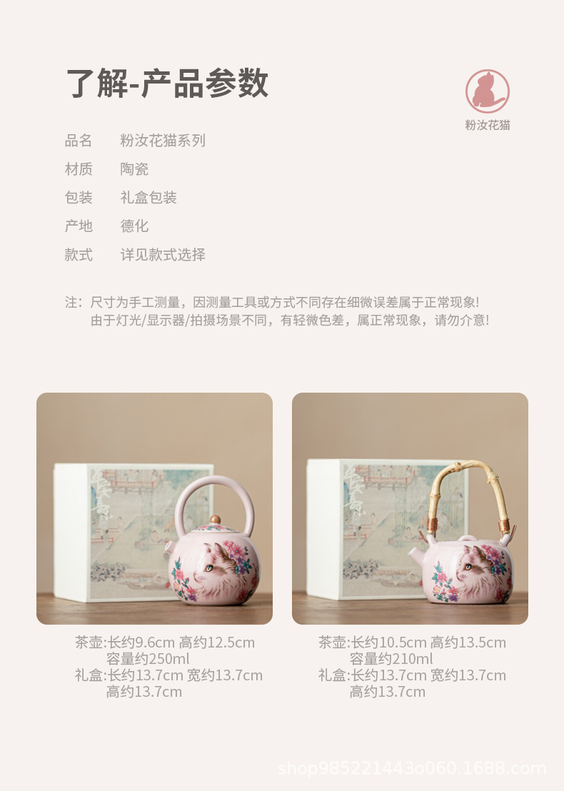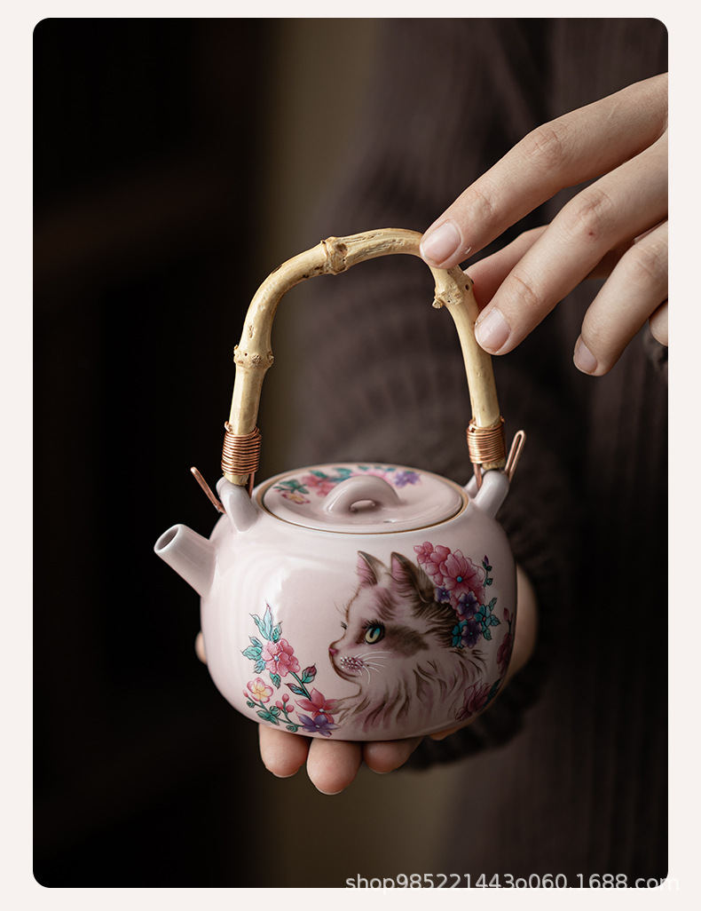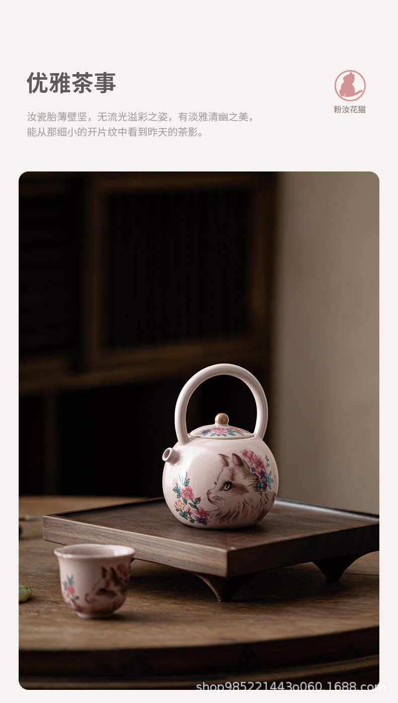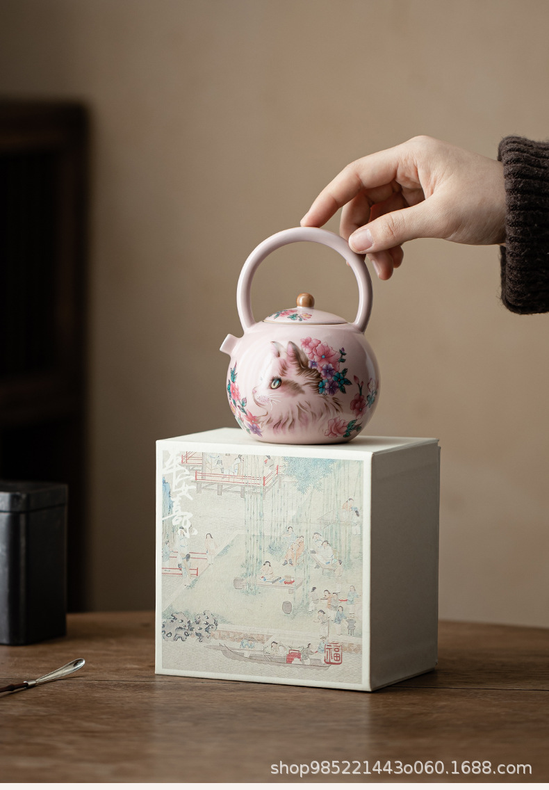 汝窯ピンク花猫陶磁器ティーポット家庭用プレゼント屋外ティーポット工夫手抽出ティーポット誕生日プレゼント