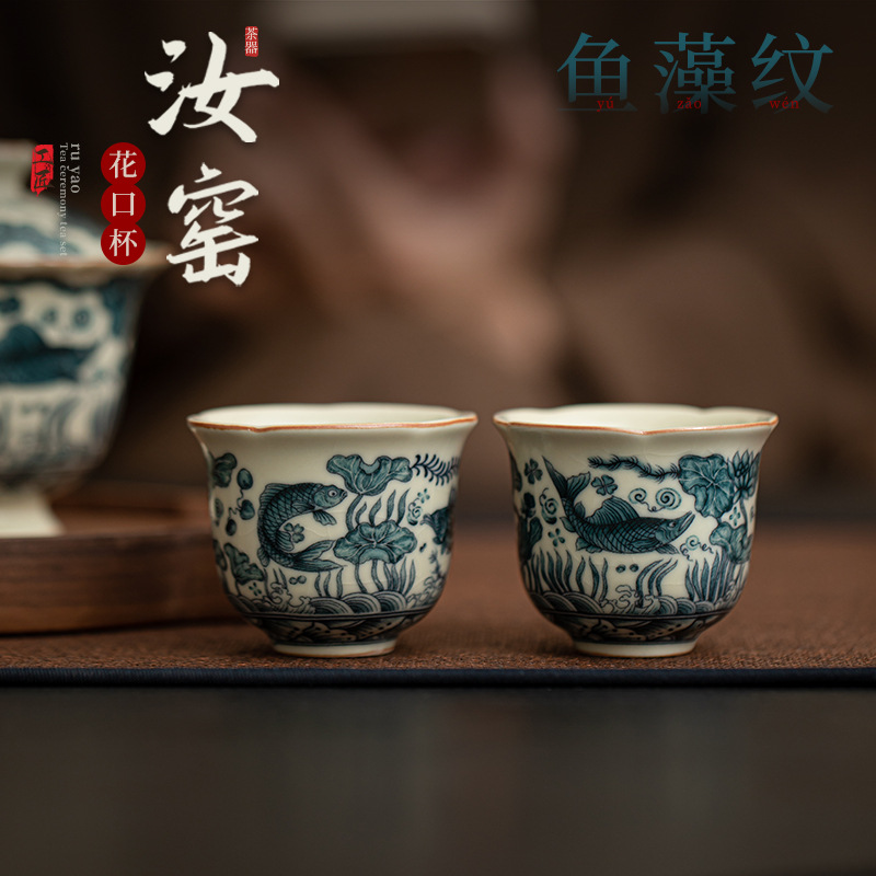 米黄汝窯魚藻紋花弁杯カンフー茶具品茗杯開片可養家庭用事務陶磁器茶杯