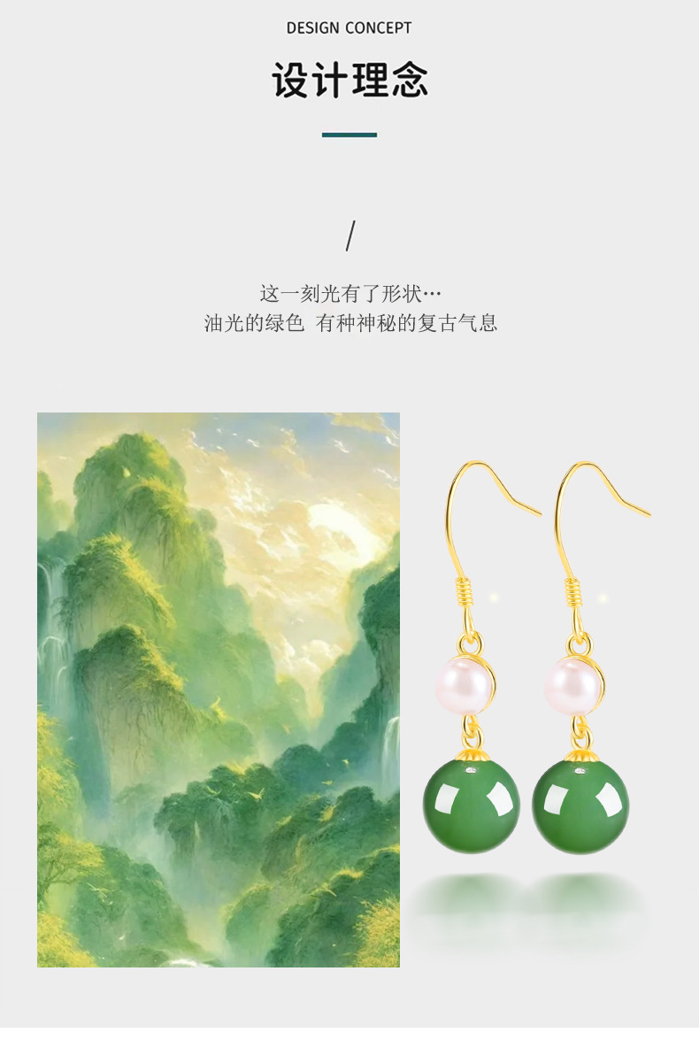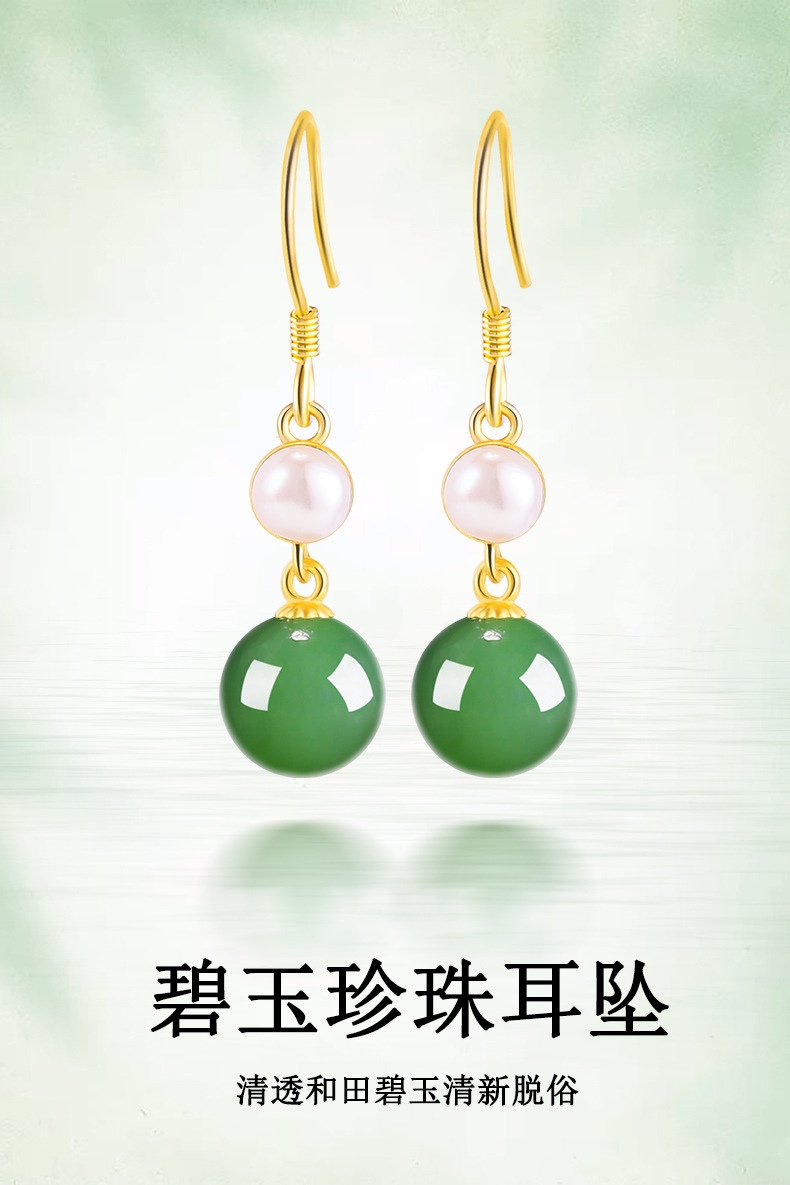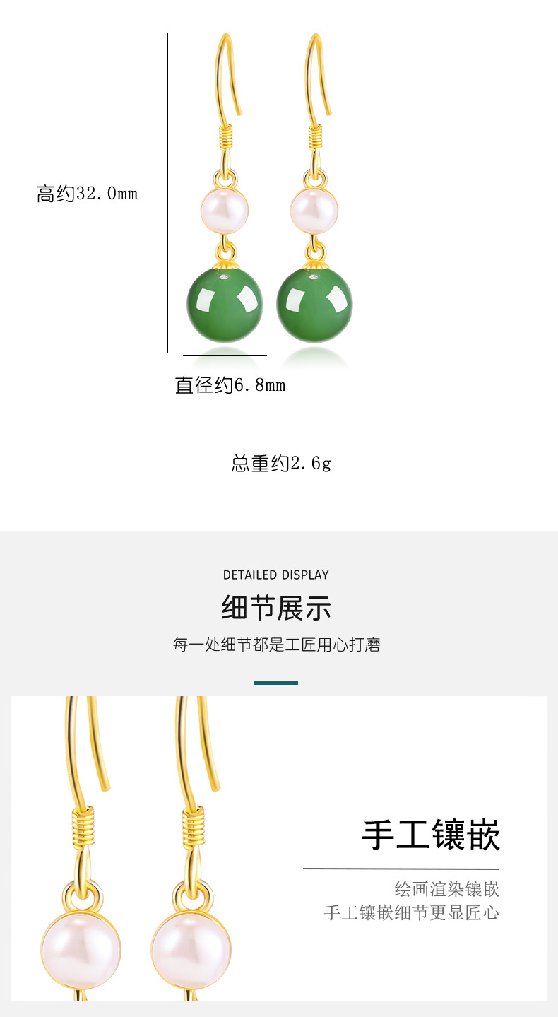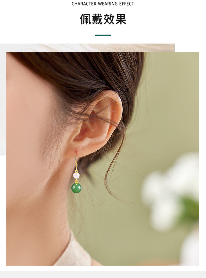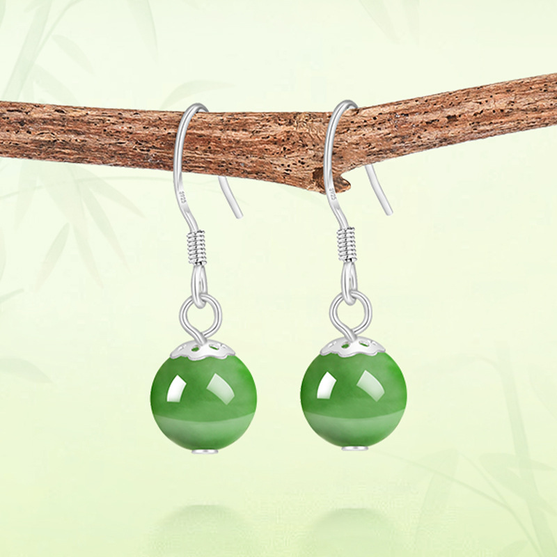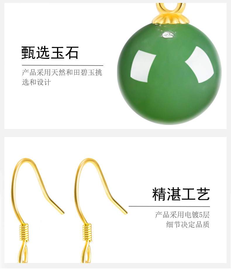 正品S925银镶天然和田玉碧玉圆珠玉石耳环时尚简约女款耳坠耳饰