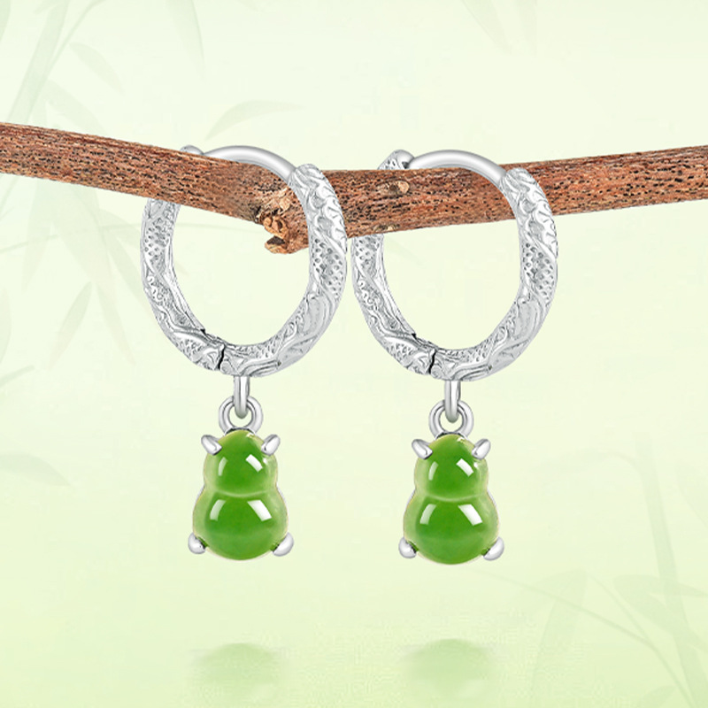 正品S925银镶天然和田玉碧玉葫芦玉石耳环时尚简约女款耳坠耳饰