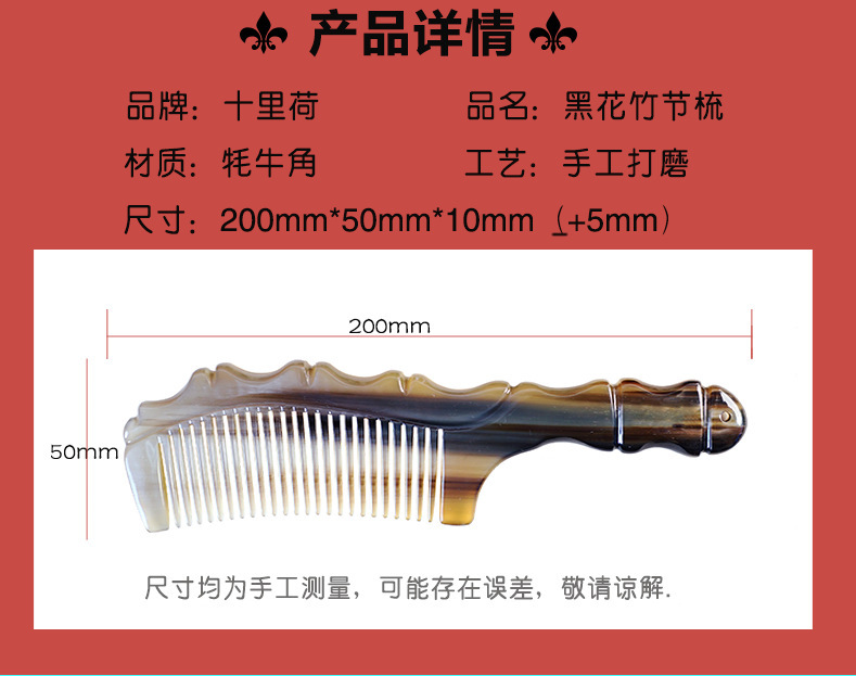 天然本物の牛角家庭用黒花竹節櫛静電気防止牛角櫛厚いヤク角経絡マッサージ櫛バッチ