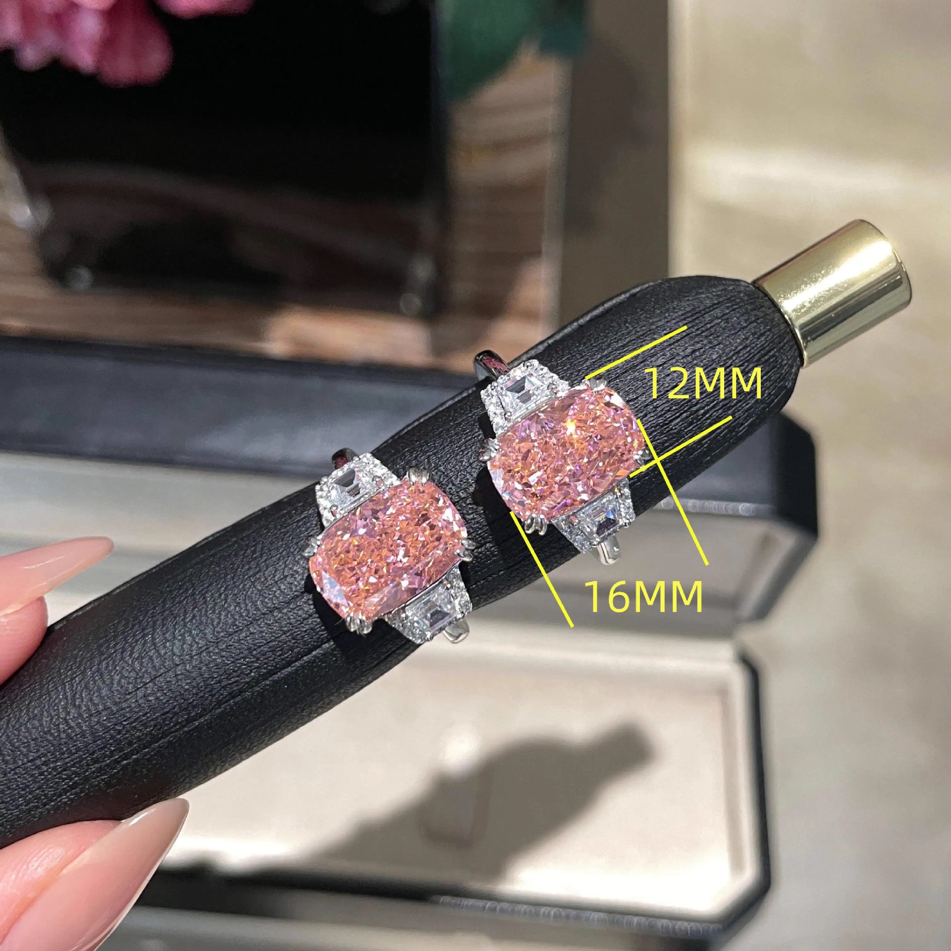ファッションの軽い豪華な桜の花粉の枕の形の方のドリルの指輪の輸入の高炭素のドリルの超きらきらと輝く粉のジルコニウムの婚約の指輪の指輪