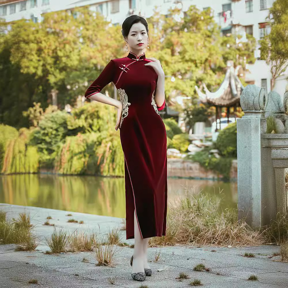2023秋冬新作ベルベット単層長型チャイナドレス復古改良民国風中袖チャイナドレス卸売り