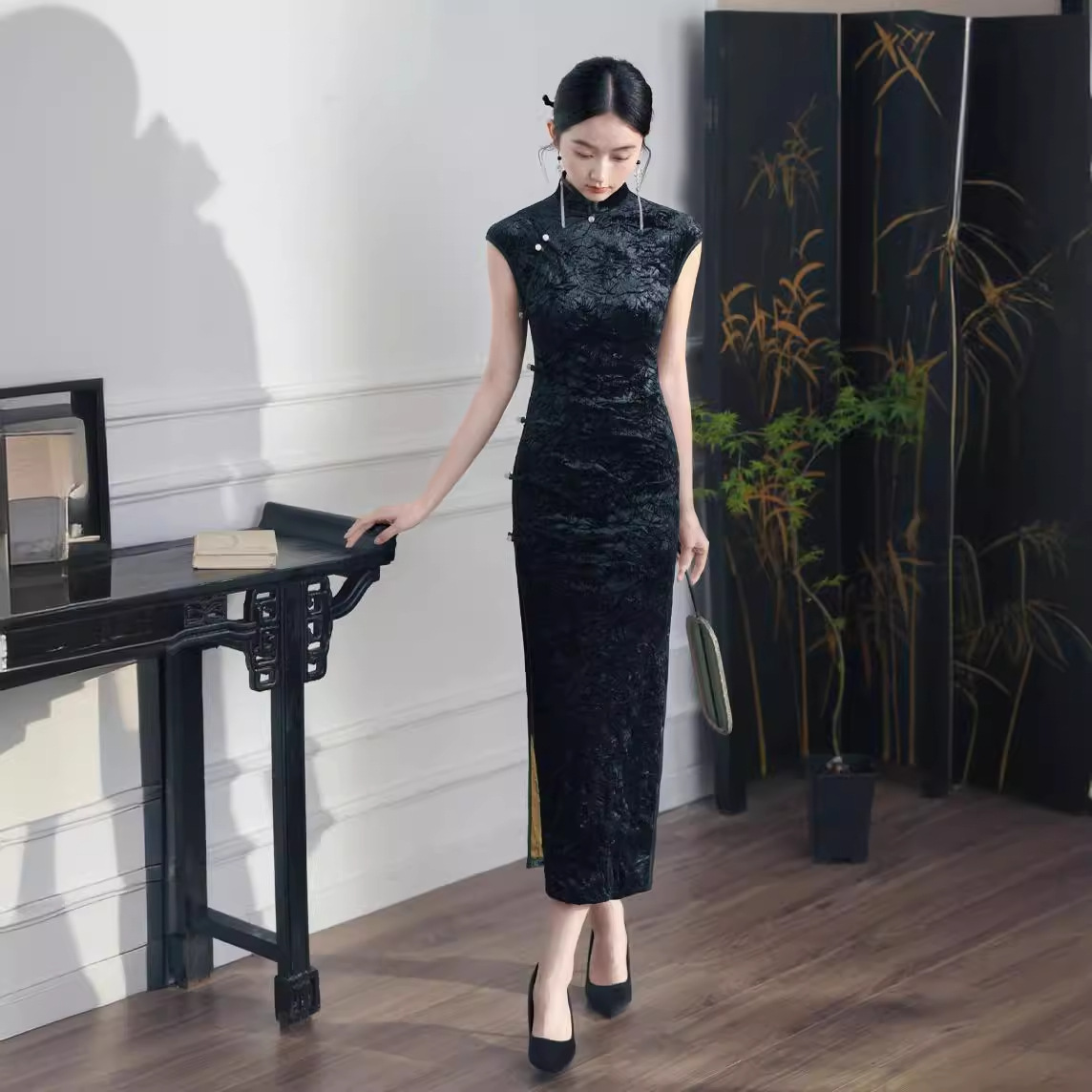 2025改良新中国式ノースリーブスリム黒レトロベルベットチャイナドレス