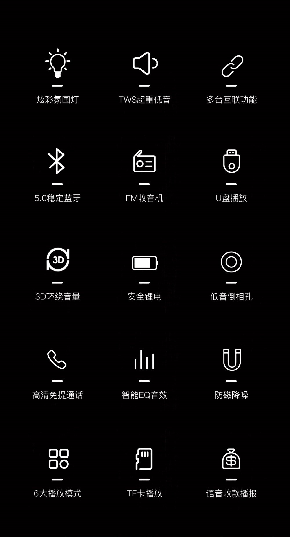 カードを挿入します,照明,超長いバッテリー寿命,Hi-Fiサウンド,マルチモード切り替え,RGB照明効果,TWSペアリング