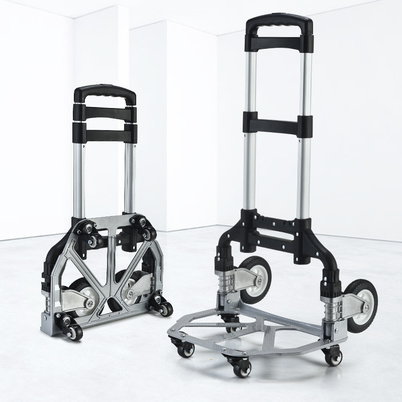 階段を登って荷物を運ぶトレーラーは家庭用手押し車を折って荷物を運ぶトラックのトロリー車を引っ張る