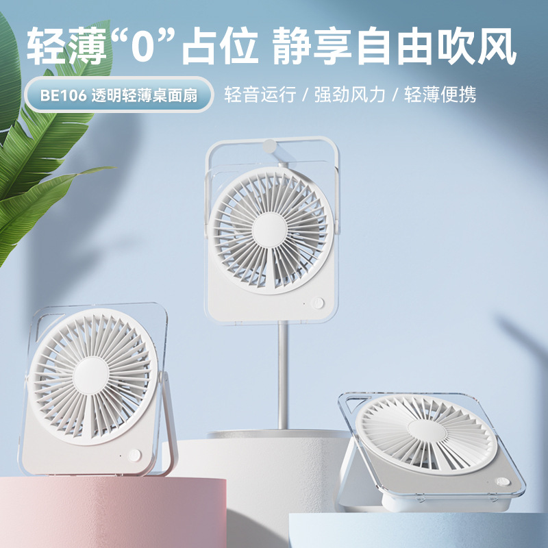 透明な超薄型デスクトップファン、超静音、吊り下げ可能、小型、充電式小型ファン、ポータブルで軽量
