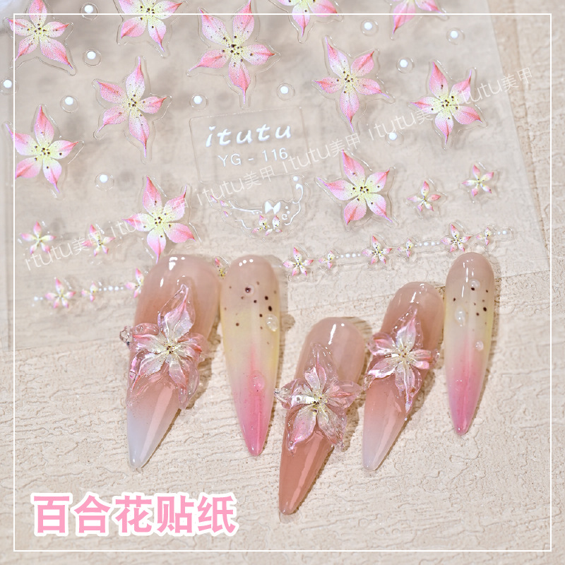 人気の百合ネイルステッカー、浮き彫りゼリーのような小さくて可愛い百合柄のネイルデコレーション