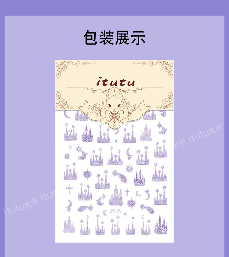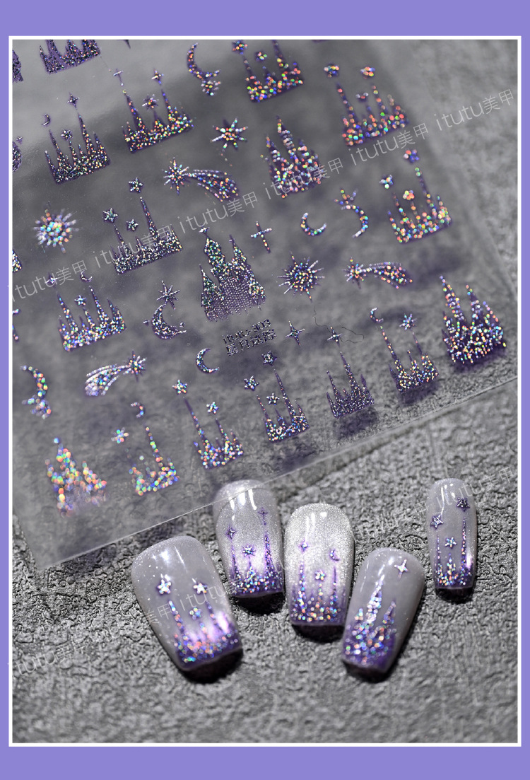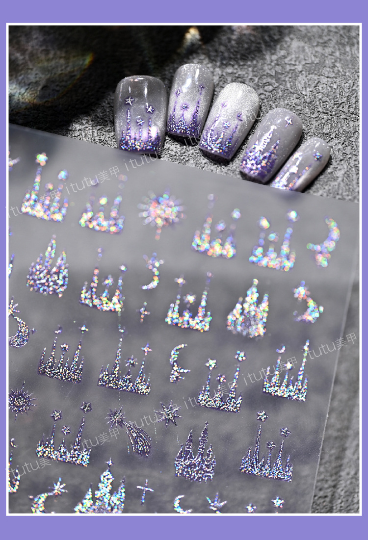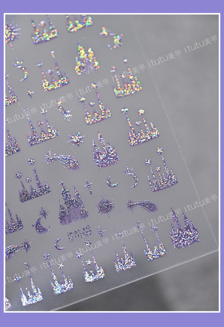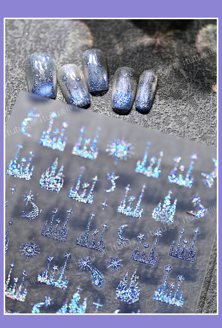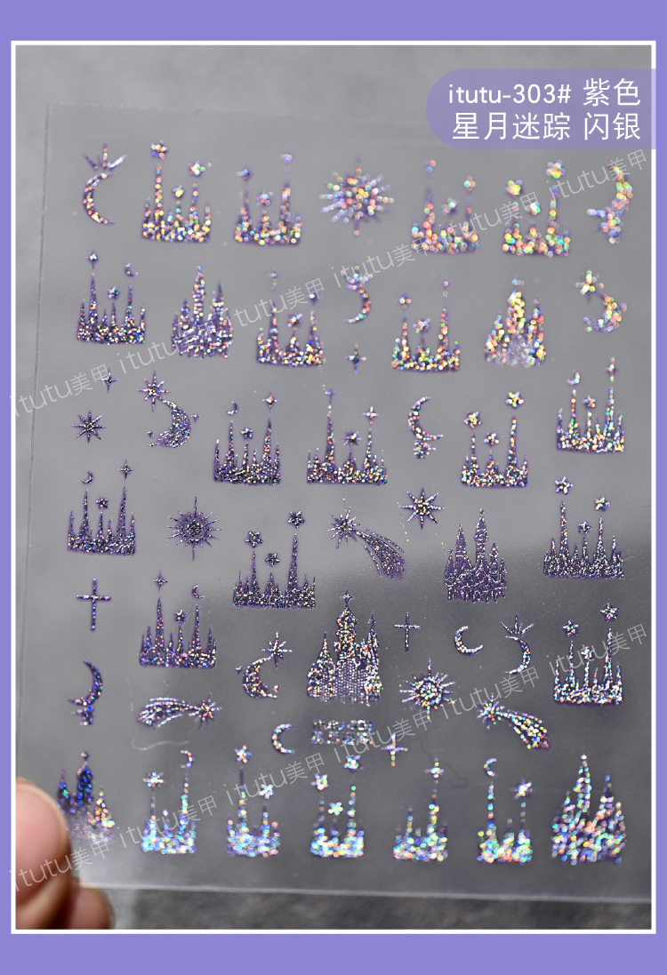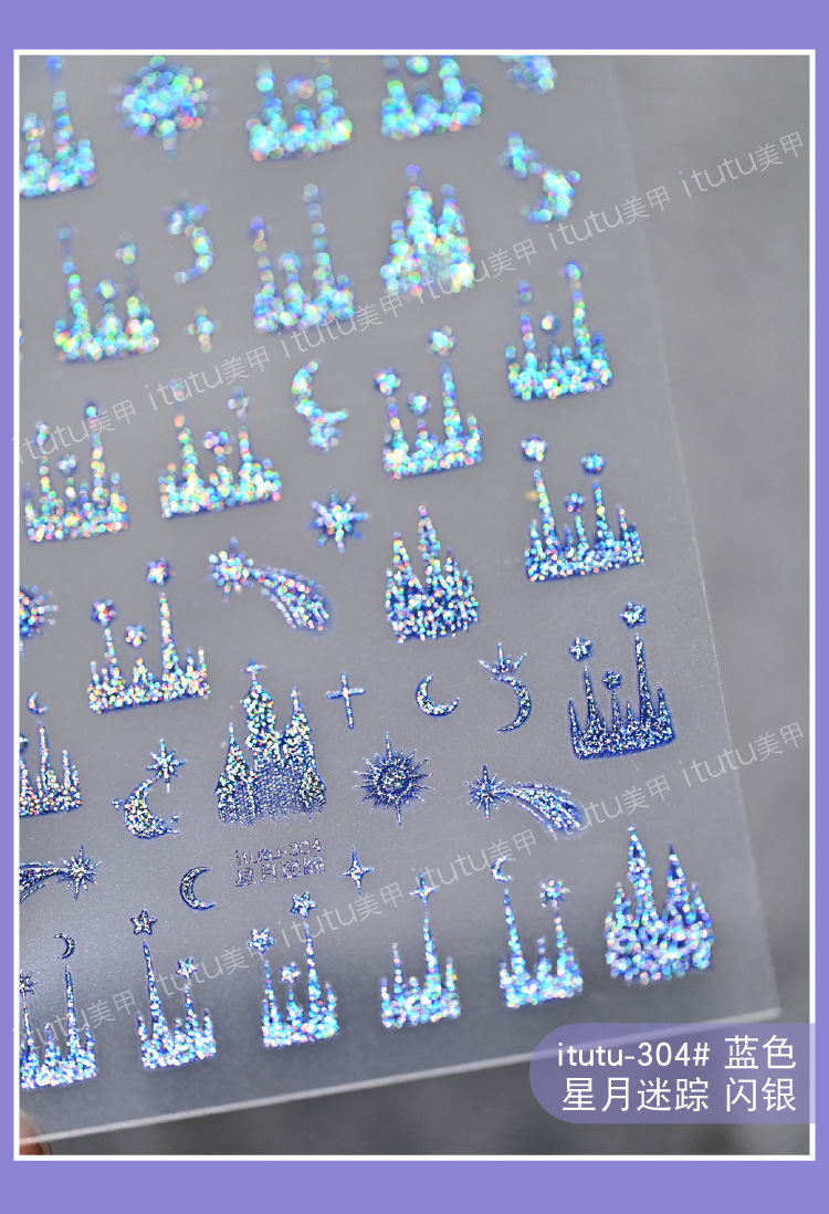 Itutu新型夢幻星月迷子浮き彫りネイルシール七彩閃銀星空月城背ゴム303