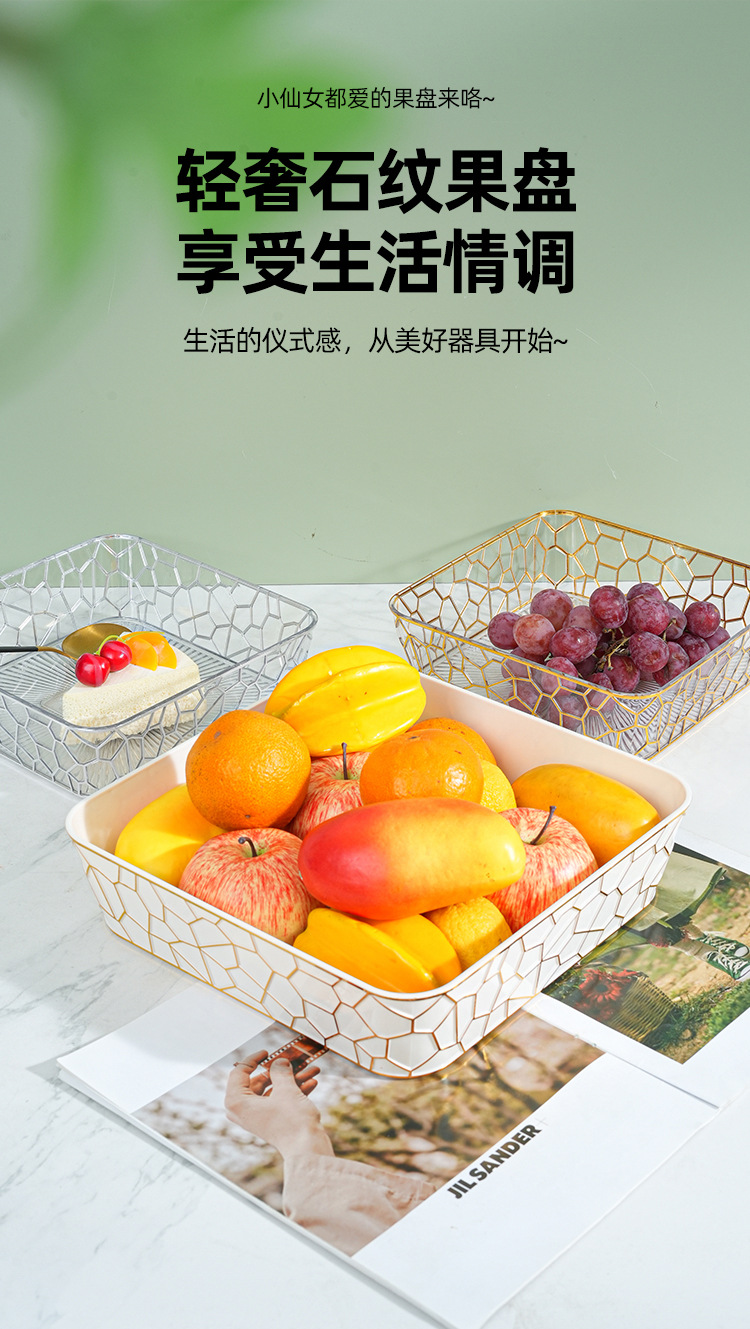 メーカー卸売長方形の厚みのある蓋付き PET フルーツプレートプラスチックゴールドエッジ収納プレートデスクトップ石模様仕上げ