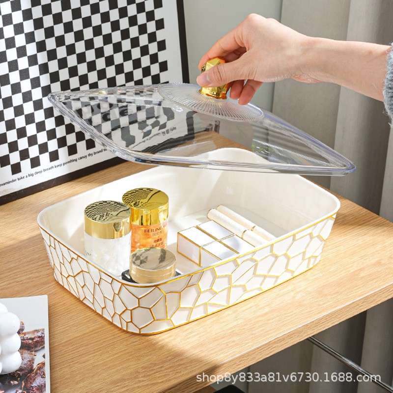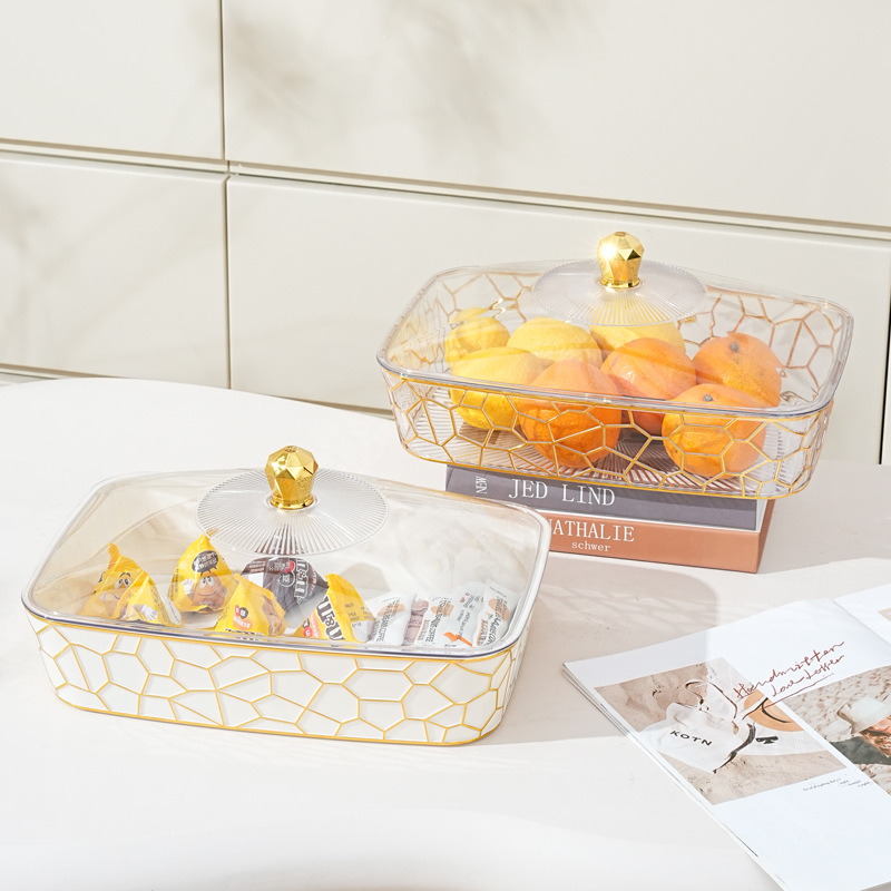 蓋付きの正方形の厚みのあるPETフルーツプレート、食品グレードの金塗装透明収納ボックス、デスクトップストーンパターン整理フルーツバスケット